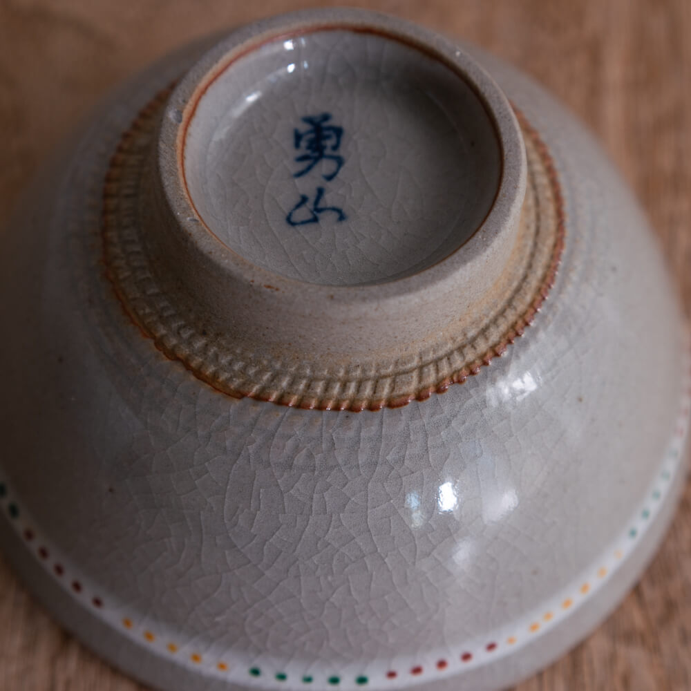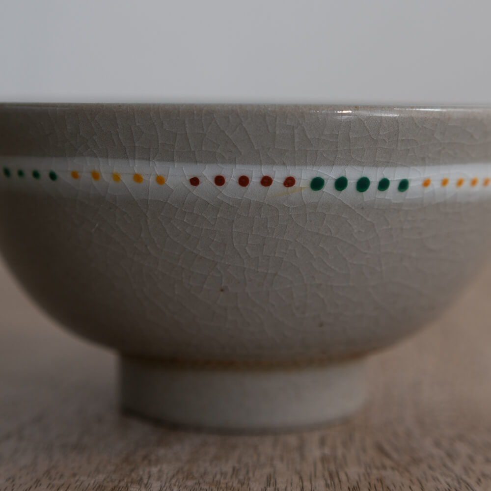 灰みを帯びた落ち着いた釉のうえに、赤・黄・緑の小さなドットが軽やかに並ぶ、あたたかな雰囲気の茶碗です。細やかな貫入が光をやわらかく反射し、ひとつずつ異なる表情が魅力。和食器らしい素朴さをもちながら、食卓に小さな彩りを添えてくれるうつわです。