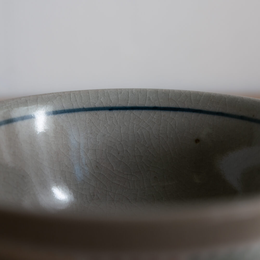 ほんのり灰みのある柔らかなグレイ釉が特徴です。光が当たると、表面の貫入がふわりと浮かび上がり、同じ色でも角度によって見え方が変わります。料理の色を邪魔しないニュートラルな色合いで、和食器にも洋食器にもなじみます。