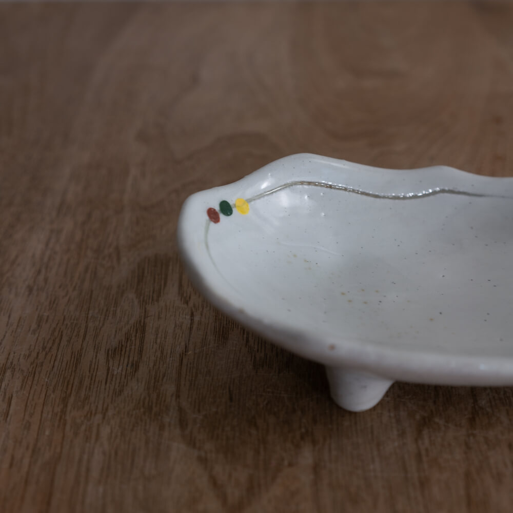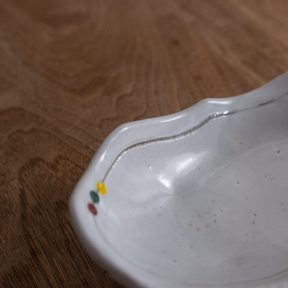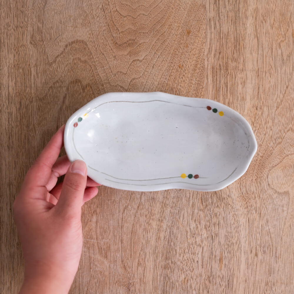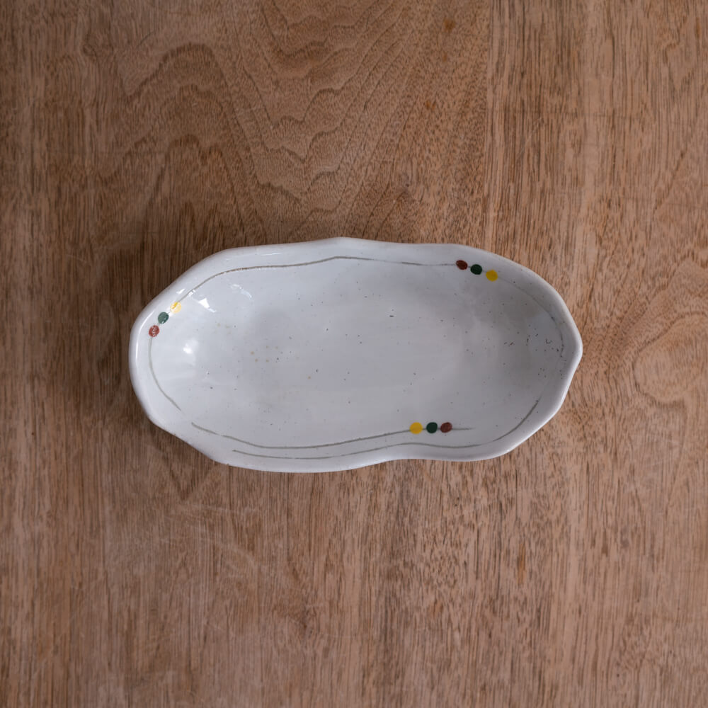 白釉のやさしい光の上に、赤・緑・黄の小さなドットがそっと添えられた楕円小鉢。三つ足ならではの軽やかな浮き感と、揺らぎのあるフォルムが、和食器らしいあたたかみを食卓にもたらします。副菜からおやつ皿まで幅広く使える、使い勝手のよい一枚です。