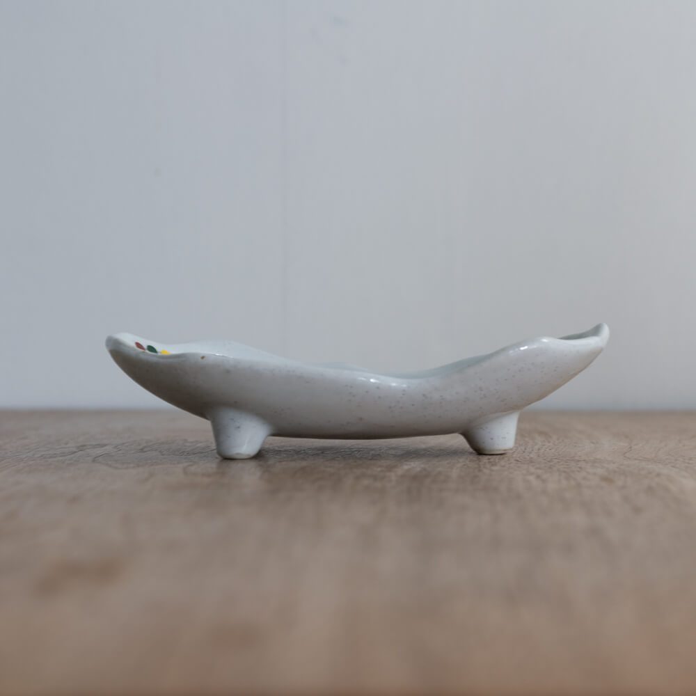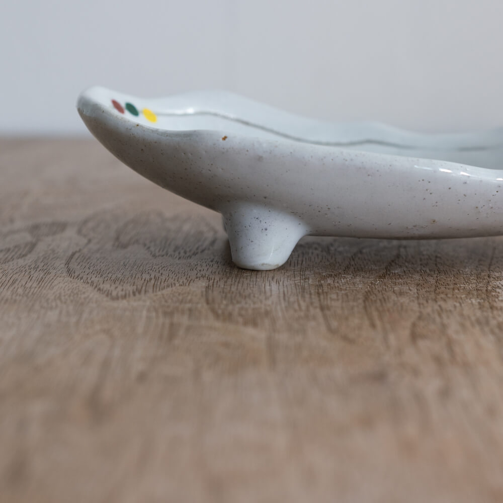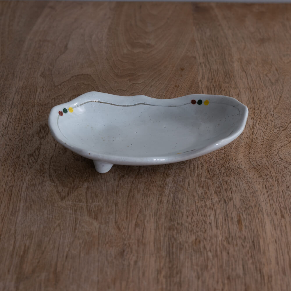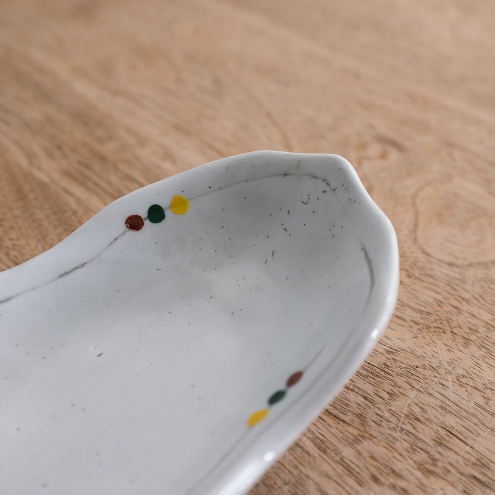 白釉のやさしい光の上に、赤・緑・黄の小さなドットがそっと添えられた楕円小鉢。三つ足ならではの軽やかな浮き感と、揺らぎのあるフォルムが、和食器らしいあたたかみを食卓にもたらします。副菜からおやつ皿まで幅広く使える、使い勝手のよい一枚です。