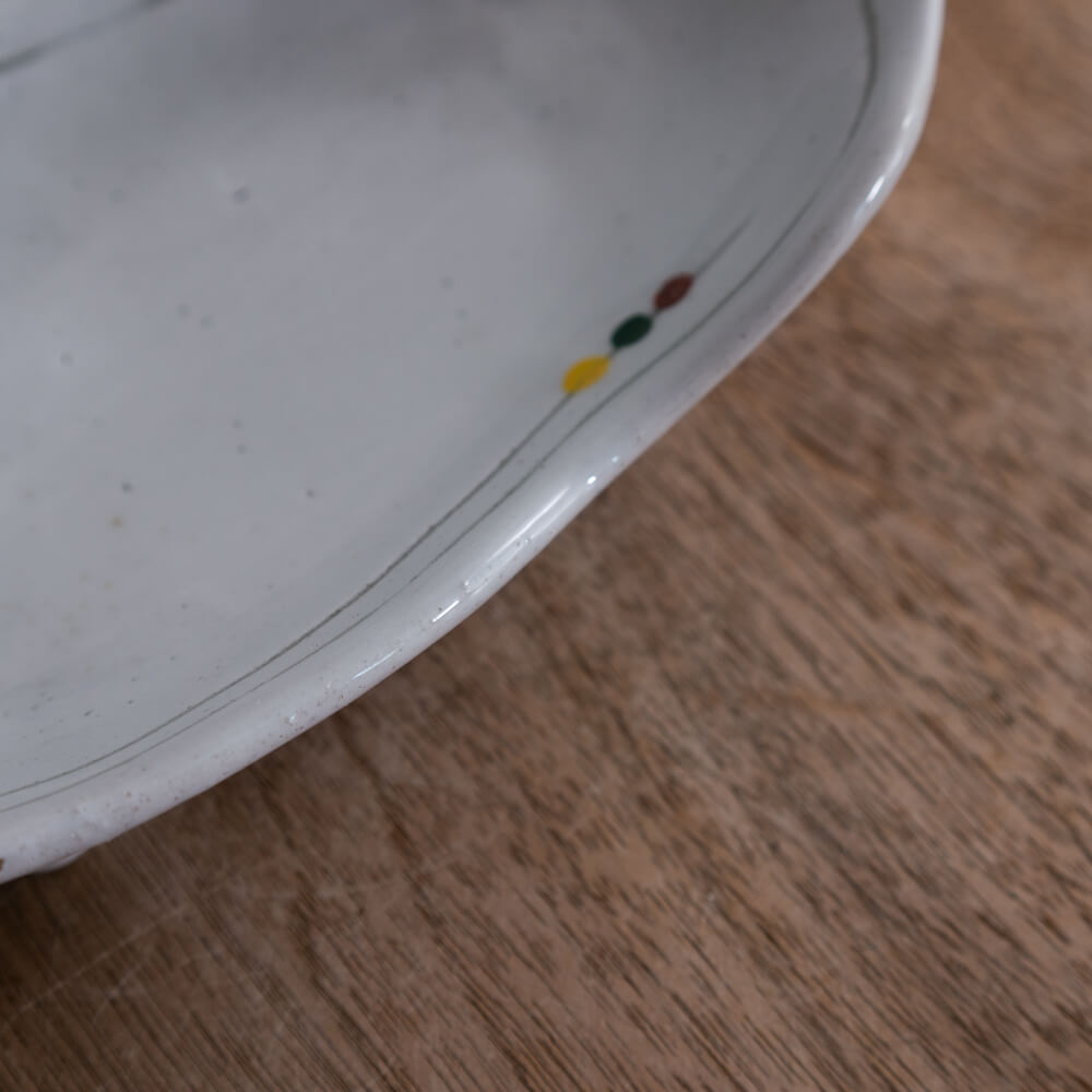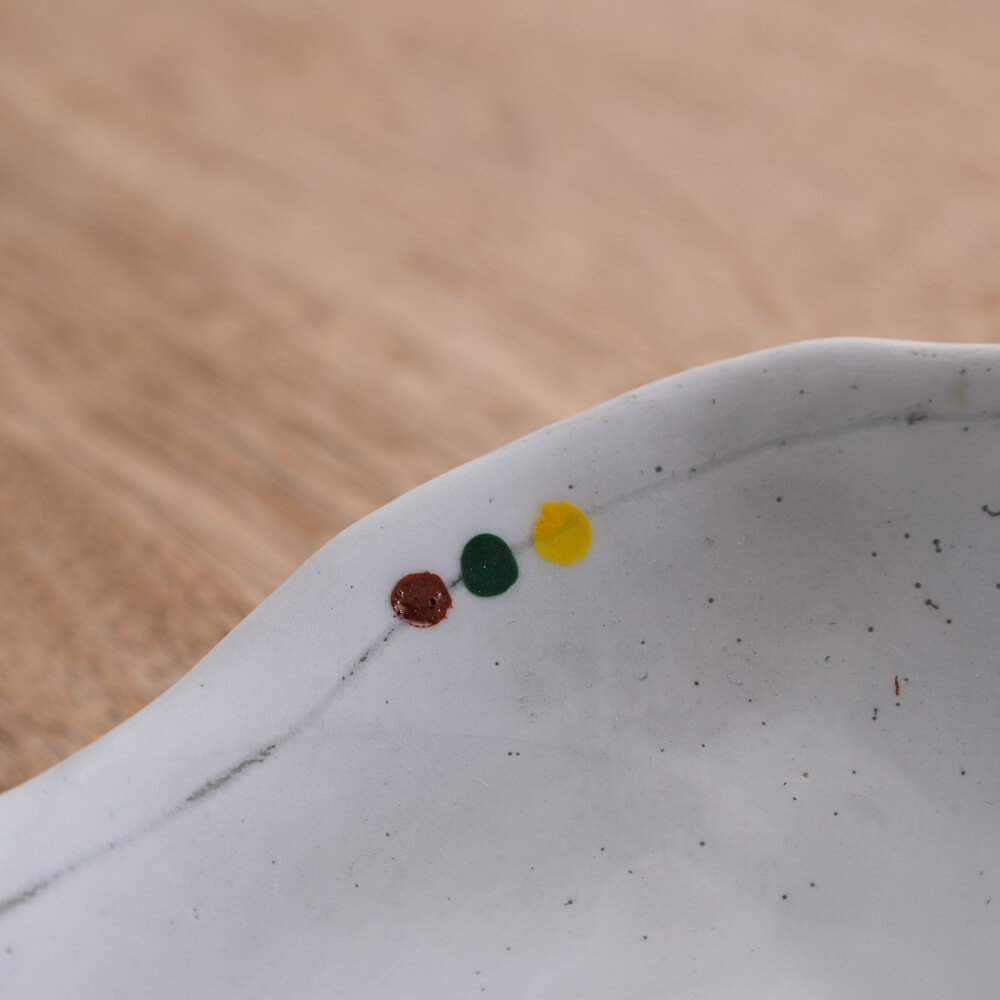 縁をなぞる細いラインのそばには、三色のドットが控えめに彩りを添えています。主張しすぎず、そっと器に表情を加えるバランスが絶妙。和惣菜から洋風のおかずまで、どんな料理にも寄り添うアクセントです。