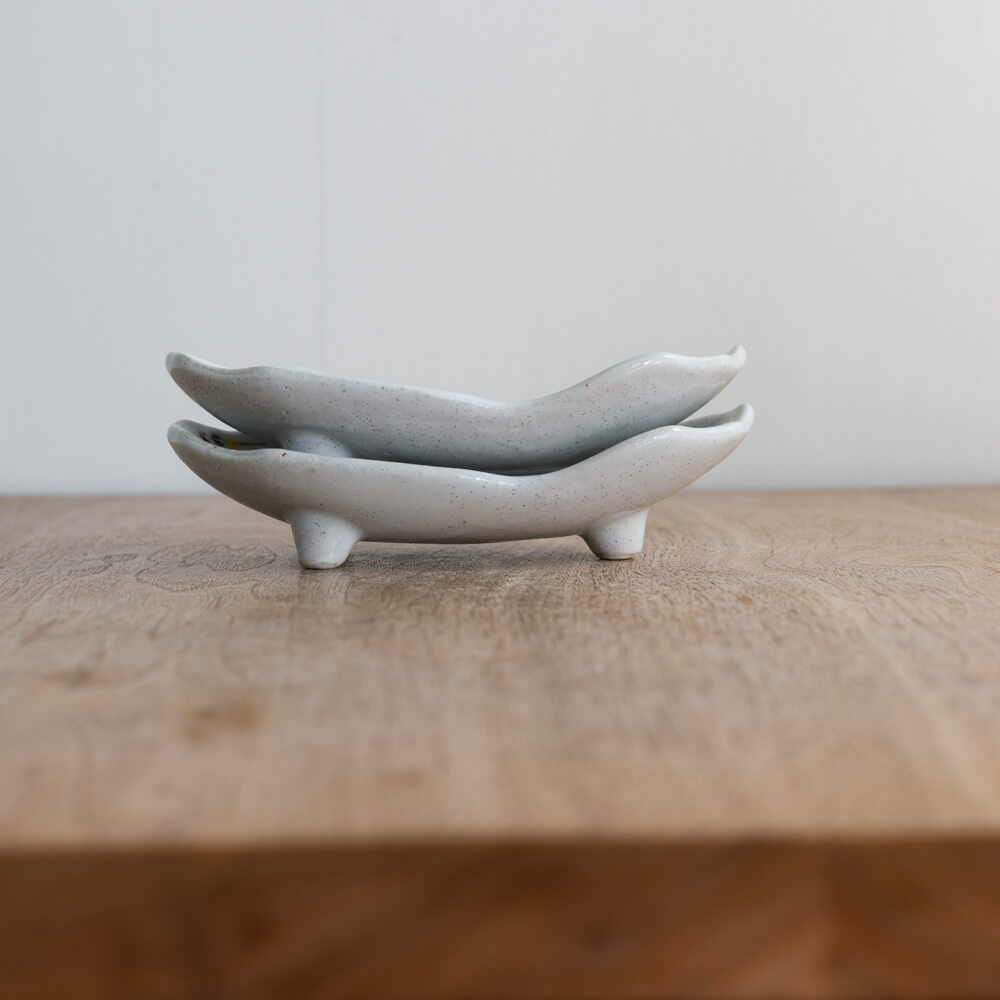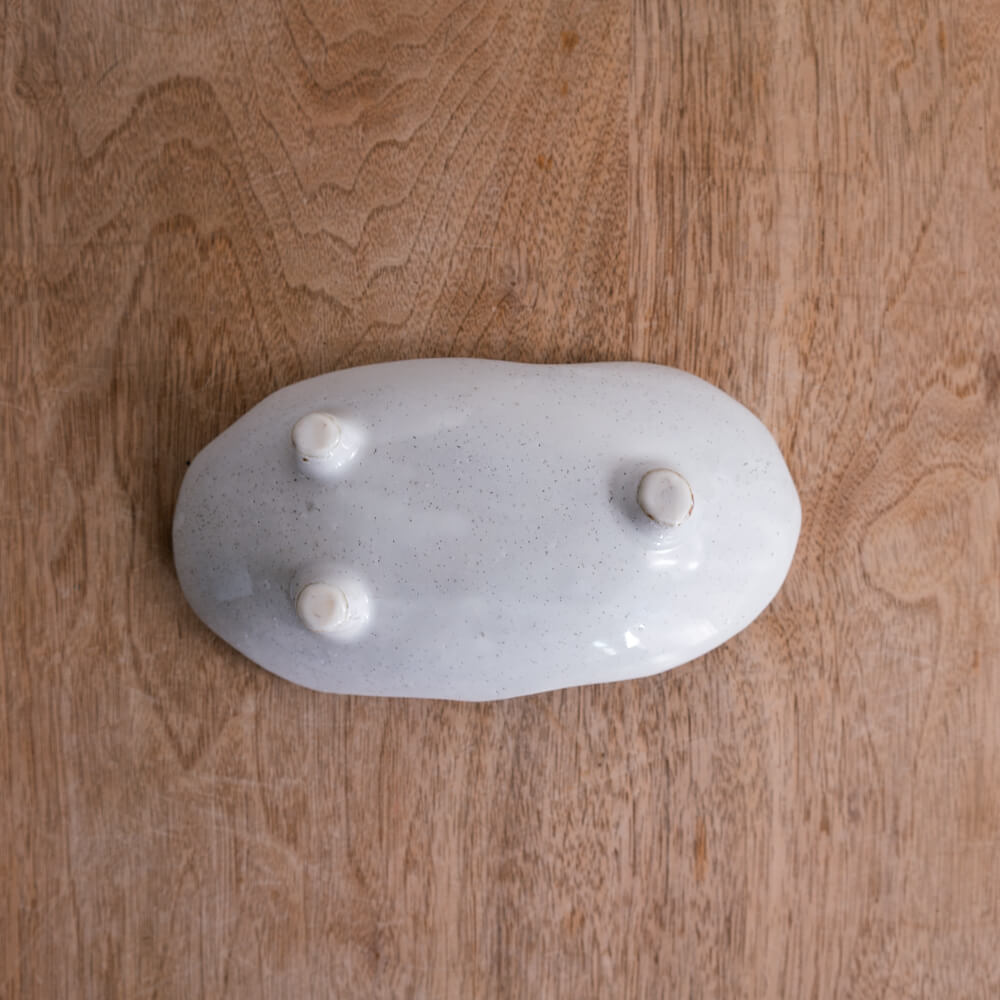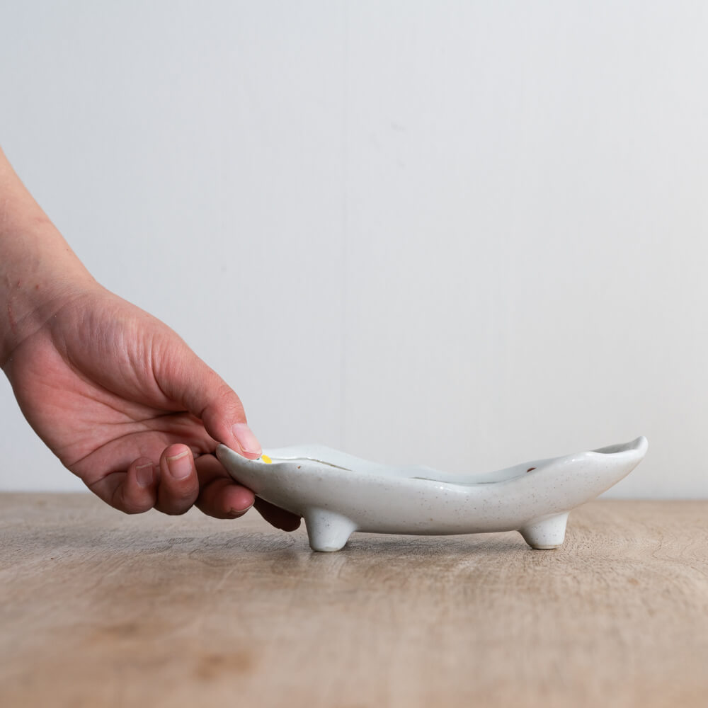 底には小さな脚が三点ついており、器がほんのり浮き上がるデザイン。影が落ちることで食卓に立体感が生まれ、同時に持ち上げやすさも向上します。見た目の可愛らしさに加え、実用性も兼ね備えた仕様です。
