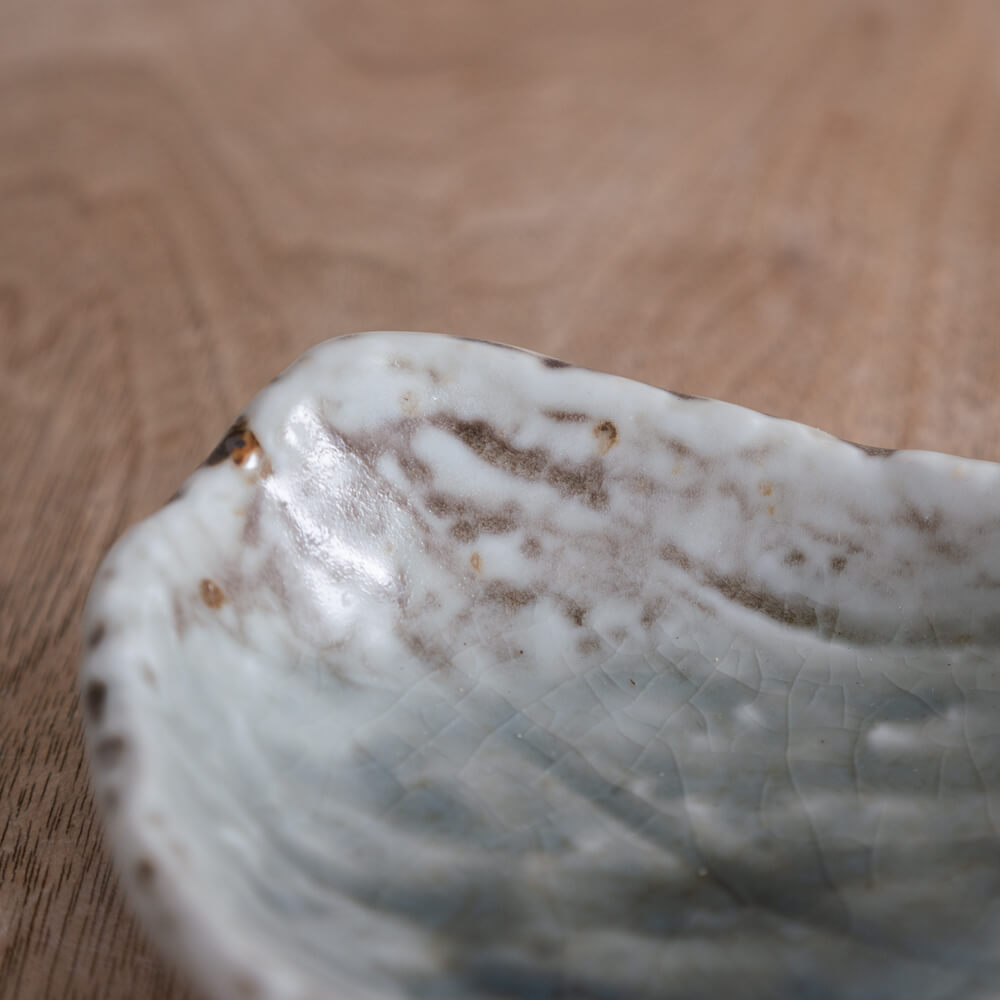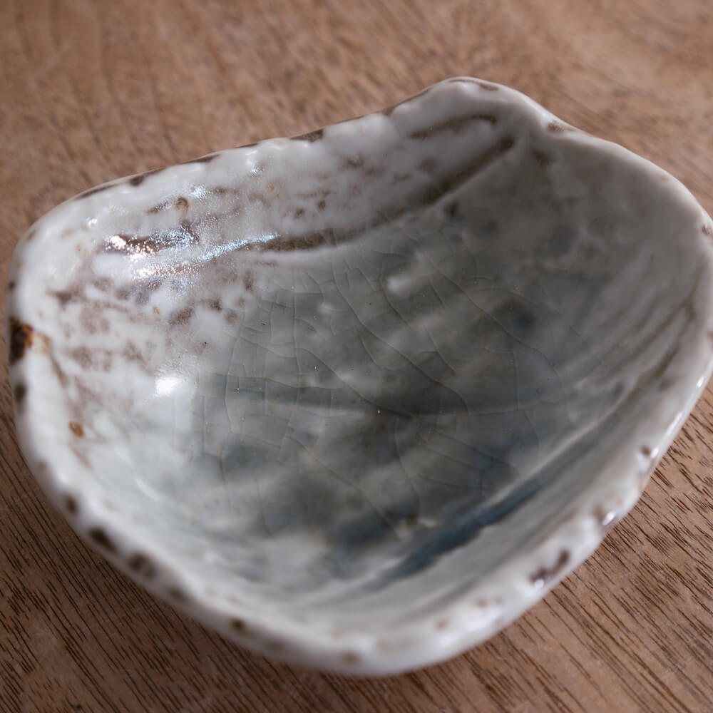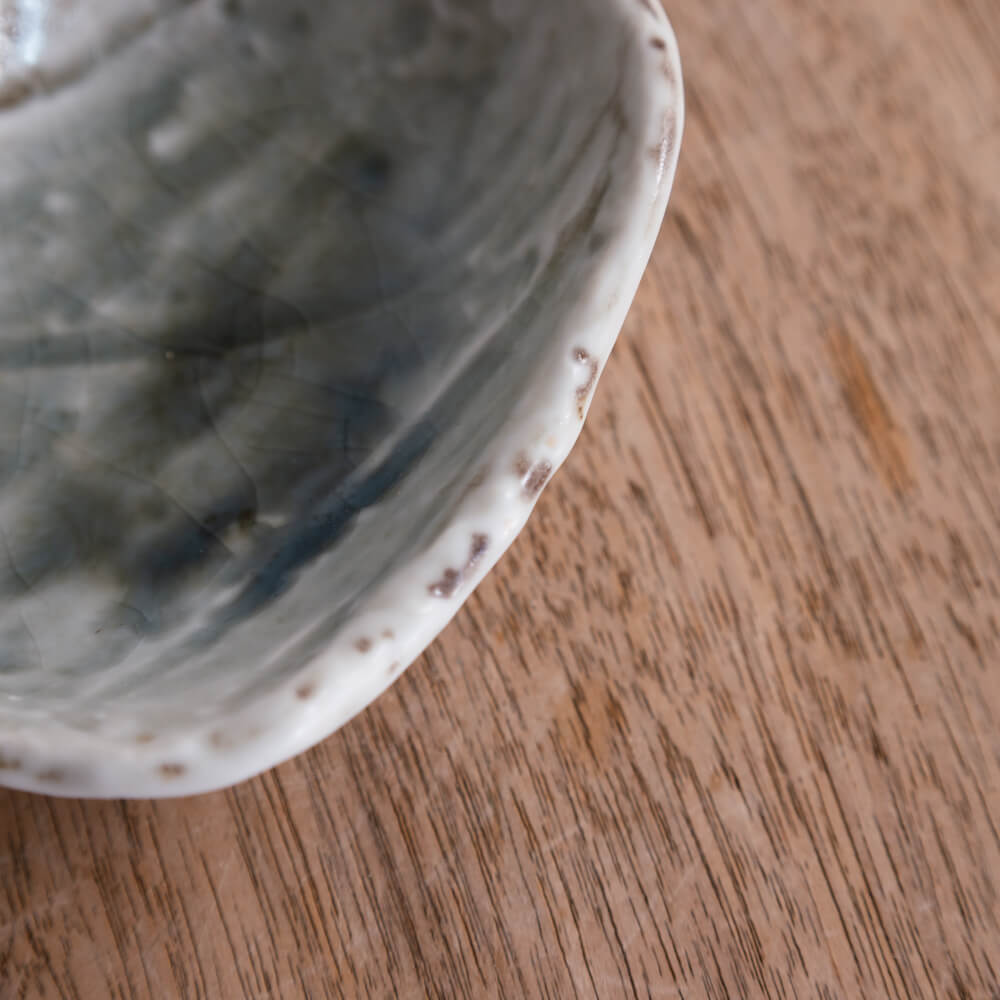 透明感のある釉薬が内側でゆるやかに広がり、青と灰が溶け合うような表情を生みます。光の角度によって淡く揺らぐ色味は、料理にさりげない陰影を添え、素材をやわらかく引き立てます。