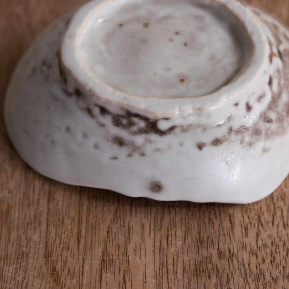 外側には白に淡い茶が重なる穏やかな釉調が施され、柔らかな陰影が生まれています。食卓にすっと馴染み、木のテーブルとも相性の良い、和食器らしいあたたかさがあります。
