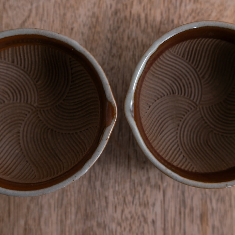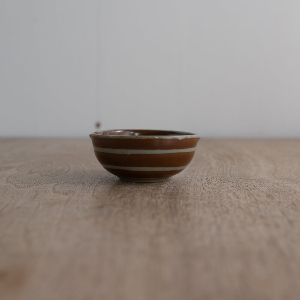 外側に施された茶釉のなめらかなツヤと、そこに一本すっと入るグレーラインが、素朴な中にもリズムを感じさせてくれます。丸みのある胴まわりに沿うように釉薬が流れ、手仕事ならではの温かみのあるニュアンスが楽しめます。