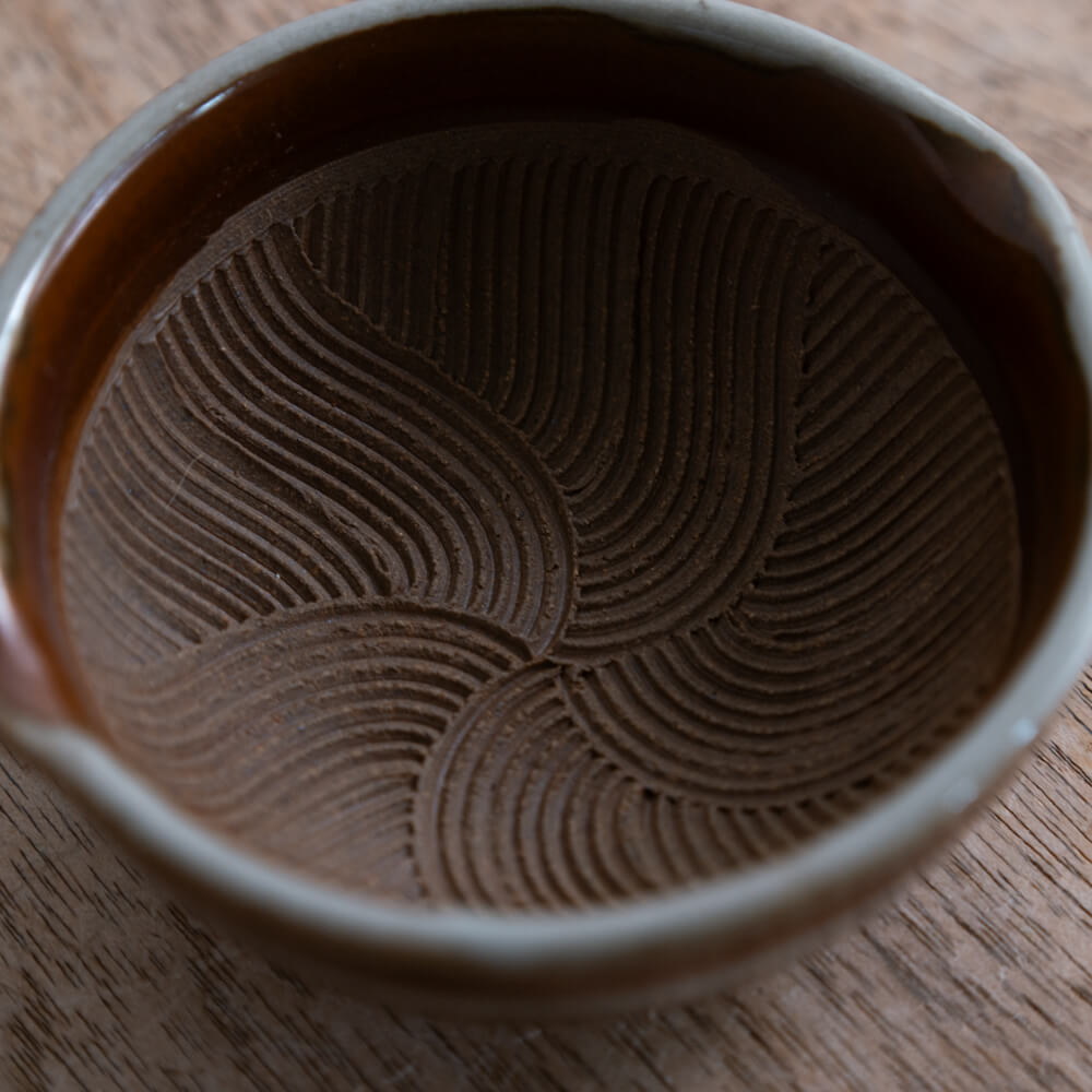 内側には、放射状に広がる細かな「すり目」が施されています。少量の調味をするときに便利で、胡麻・生姜・にんにくなどを軽くすり合わせるのに最適。深さ3cmの小ぶりなサイズ感が、食卓での“ちょい使い”にも活躍します。