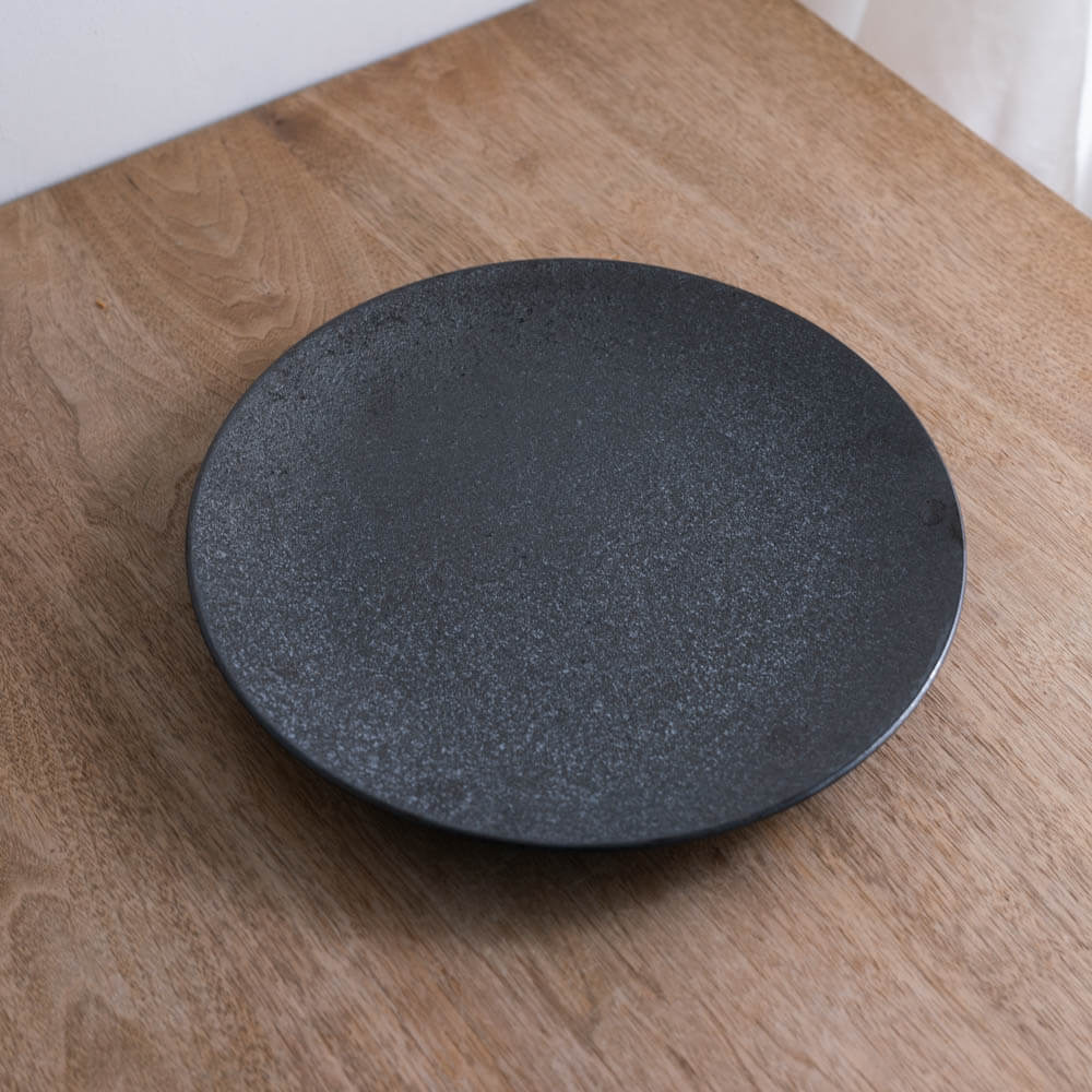 黒でもなく、グレーでもない。炭のように奥行きのある色合いは、光の当たり方で表情を変え、料理の色彩をやさしく受け止めます。主張しすぎないのに、確かな印象を残す佇まいです。