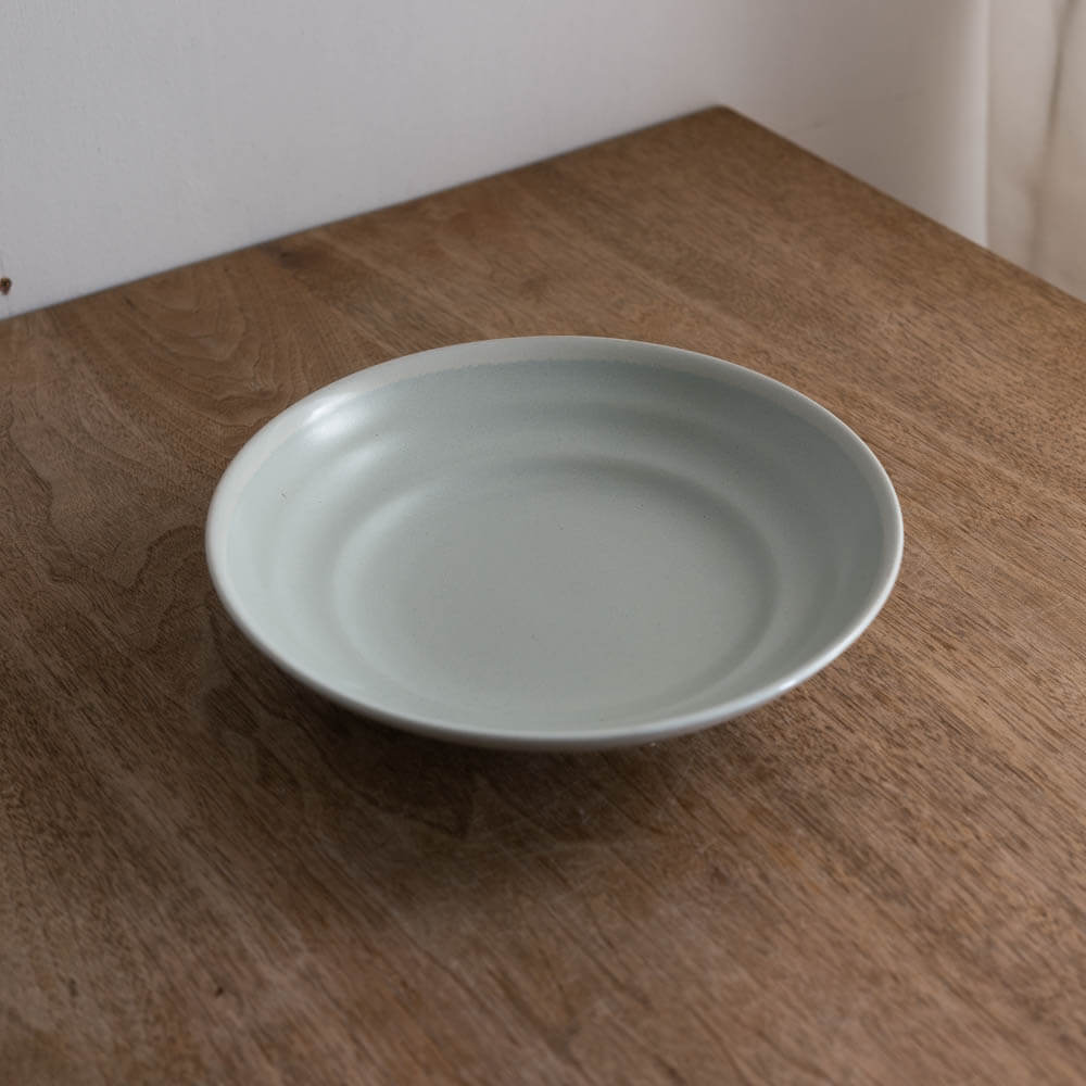淡く青みを含んだ釉薬が、光の加減でやさしく表情を変える一枚。主張しすぎない色合いと、ほどよい深さを持つフォルムが、麺料理はもちろん、盛り付けそのものを美しく整えてくれます。静かな存在感がありながら、毎日の食卓に自然と溶け込む。そんな“使うほどに良さが伝わる”和食器です。
