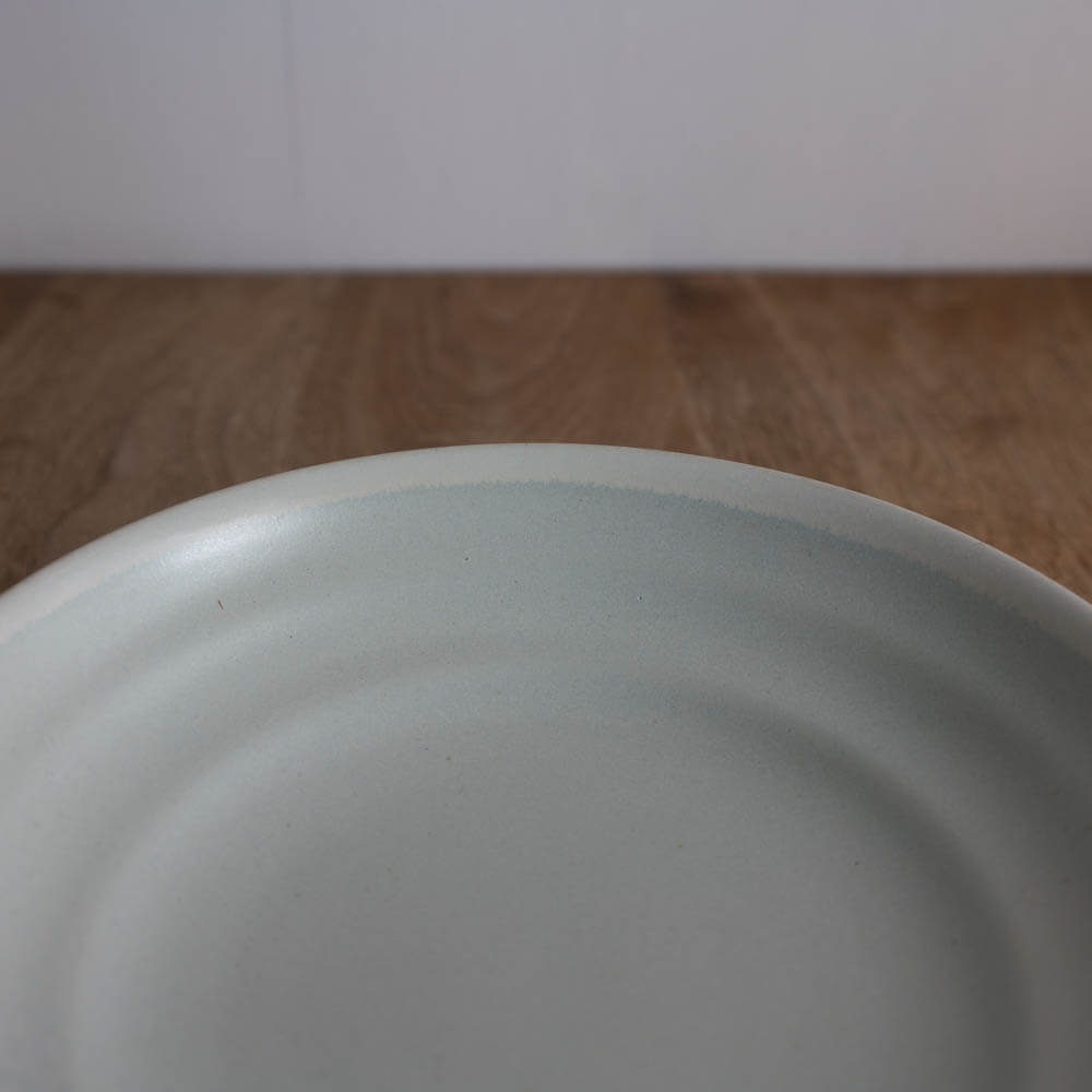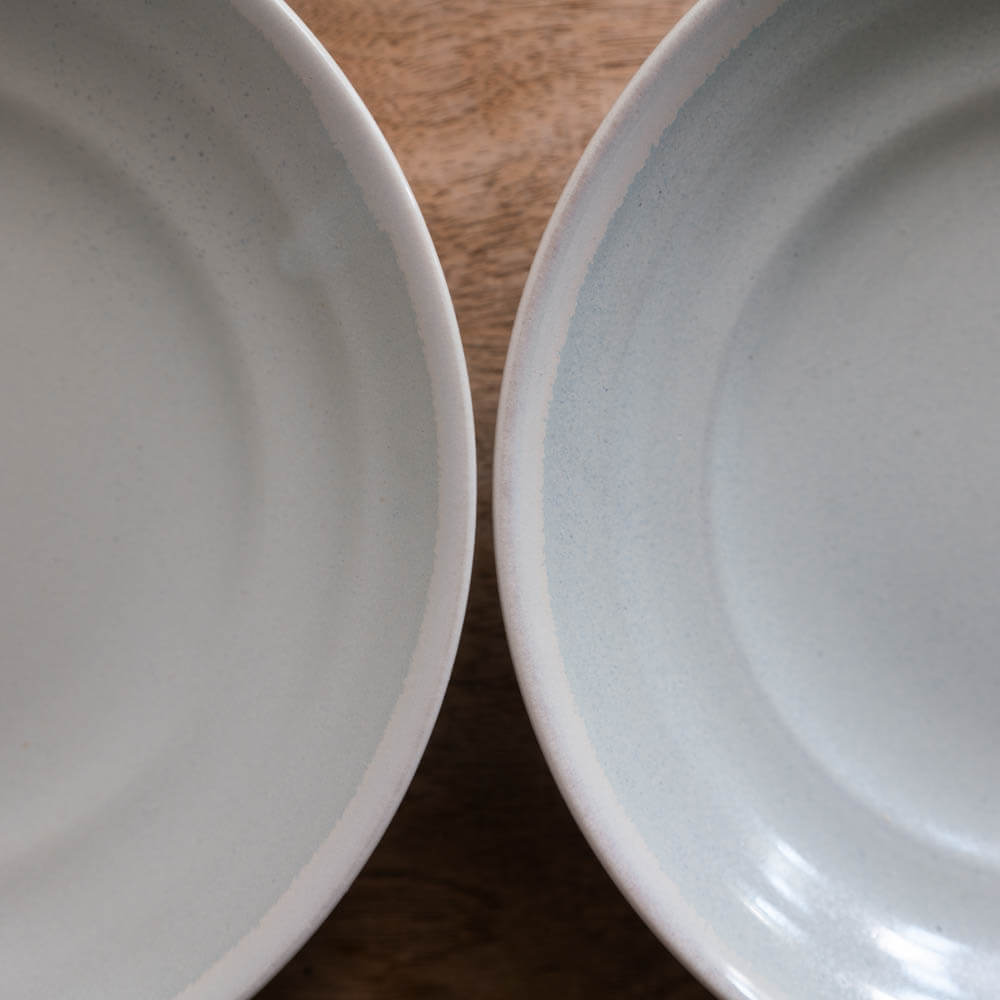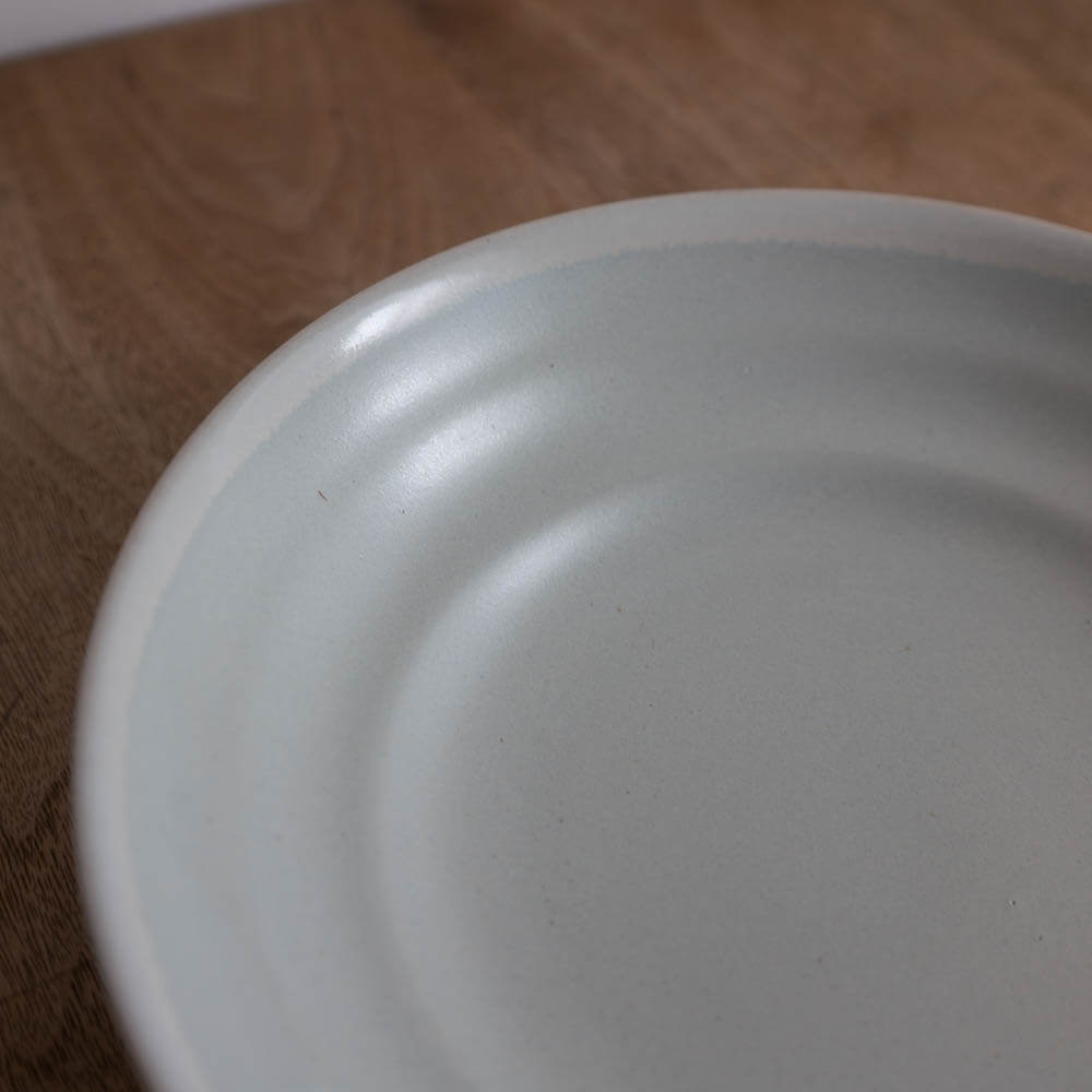 全体に広がるのは、白に近い淡い青みを含んだ釉のグラデーション。縁に向かってわずかに濃淡が現れ、手仕事ならではの揺らぎが感じられます。料理の色を邪魔せず、むしろ引き立てる“受け止め役”として優秀な一枚です。