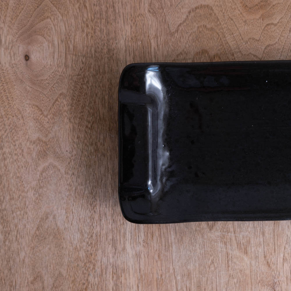 食卓に並べた瞬間、料理の輪郭がすっと整う。この長皿は、盛りつけるだけで“きちんとした一皿”に見せてくれる存在です。深みのある黒に、油滴のような揺らぎ。光を受けて静かに表情を変えながら、料理そのものを引き立ててくれます。派手さはないのに、なぜか目に留まる。そんな静かな存在感をもつ一枚です。