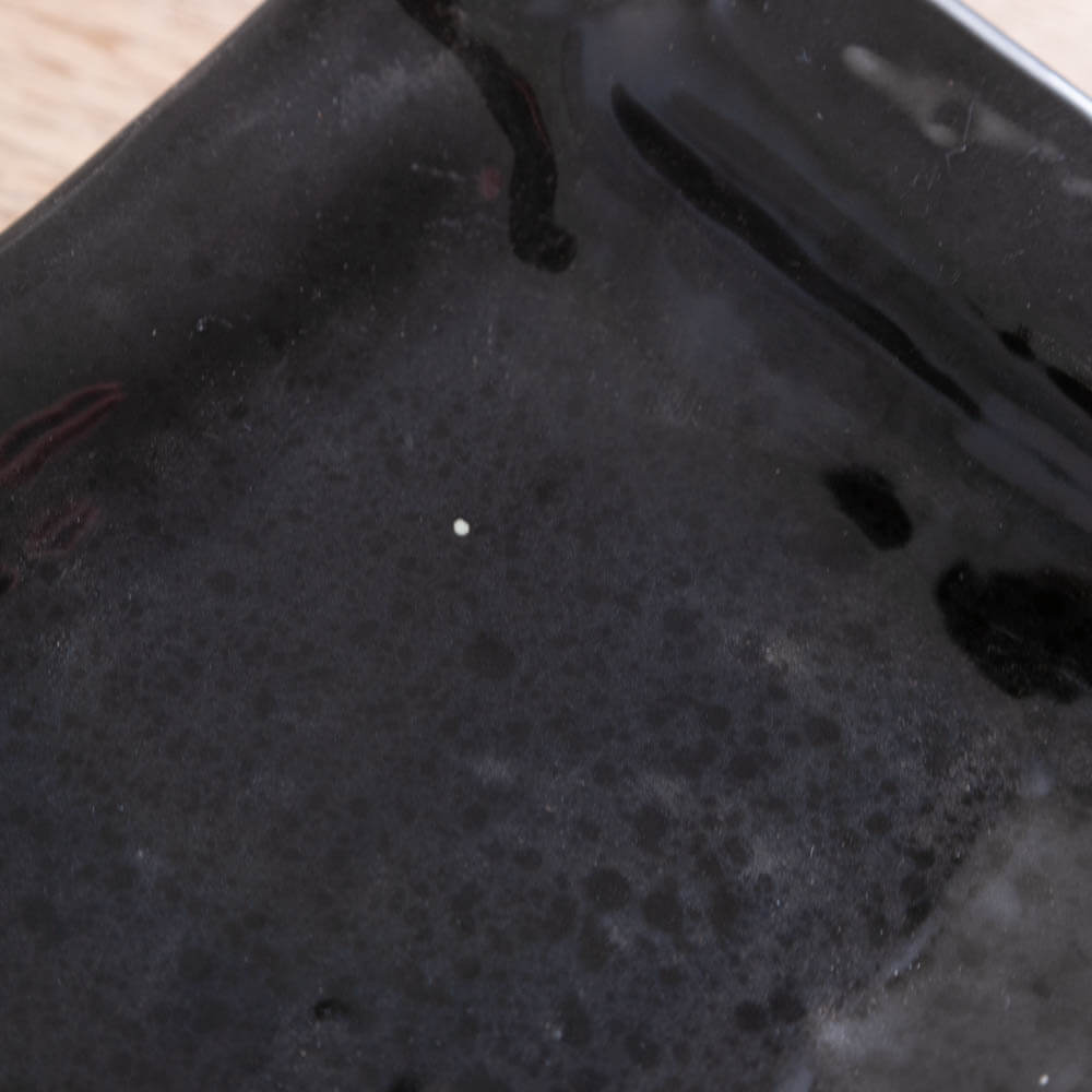 表面に現れる油滴のような斑点は、一点一点異なる表情。光の角度によって濃淡が変わり、静かな動きを感じさせます。黒一色でありながら、単調にならず、料理の色味をやさしく引き立てる奥行きがあります。