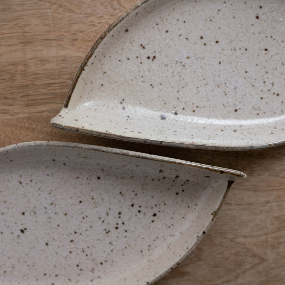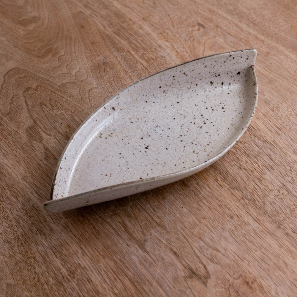 静かに伸びる輪郭と、ゆるやかに流れるフォルム。この器は、料理を主役にしながら、そっと美しさを添えてくれます。うのふ釉ならではのやわらかな白と、自然に浮かぶ鉄点。主張しすぎず、けれど確かな存在感で、日々の食卓に心地よい余白を生み出します。盛りつけるだけで、自然と整う。そんな“頼れる一枚”です。