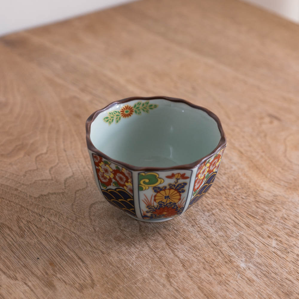 赤・青・緑・金彩を思わせる錦調の色絵が、器全体をリズミカルに彩ります。文様ごとに表情が異なり、見る角度によって印象が変わるのも魅力。料理を盛っても柄が沈まず、器そのものの存在感がほどよく残ります。