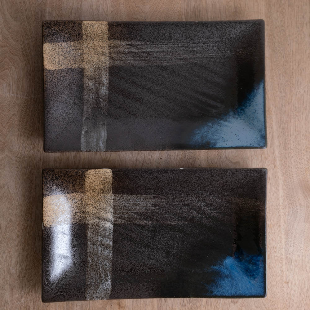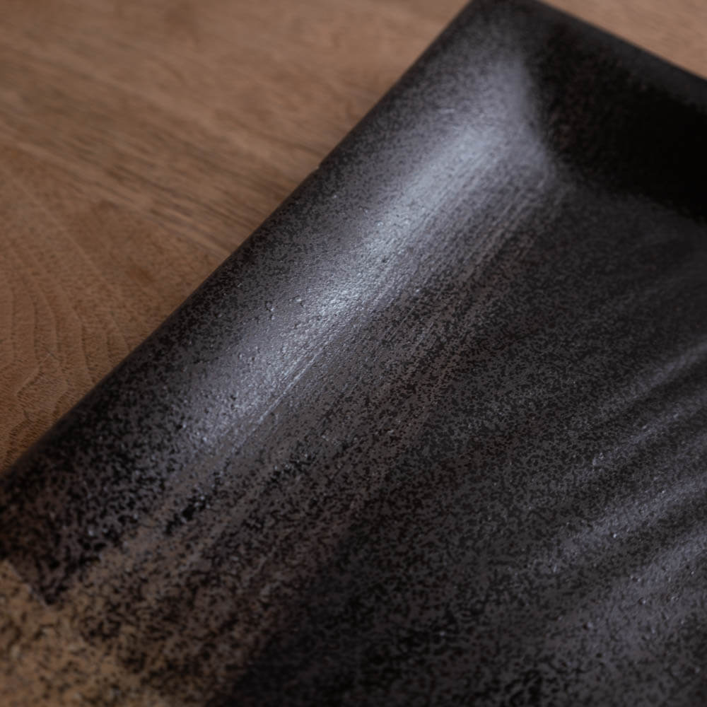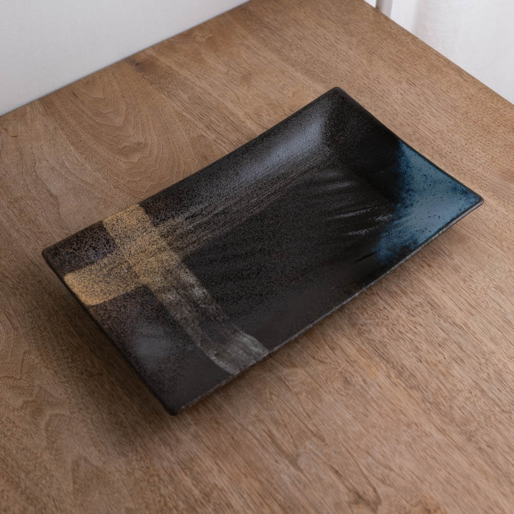 静かな存在感をまとった、長角のうつわ。深みのある黒に、にじむような青やベージュの表情が重なり、まるで一枚の景色を切り取ったような佇まいです。盛りつけることで完成するのではなく、「余白ごと、美しく整う」。そんな感覚をそっと教えてくれる一枚です。