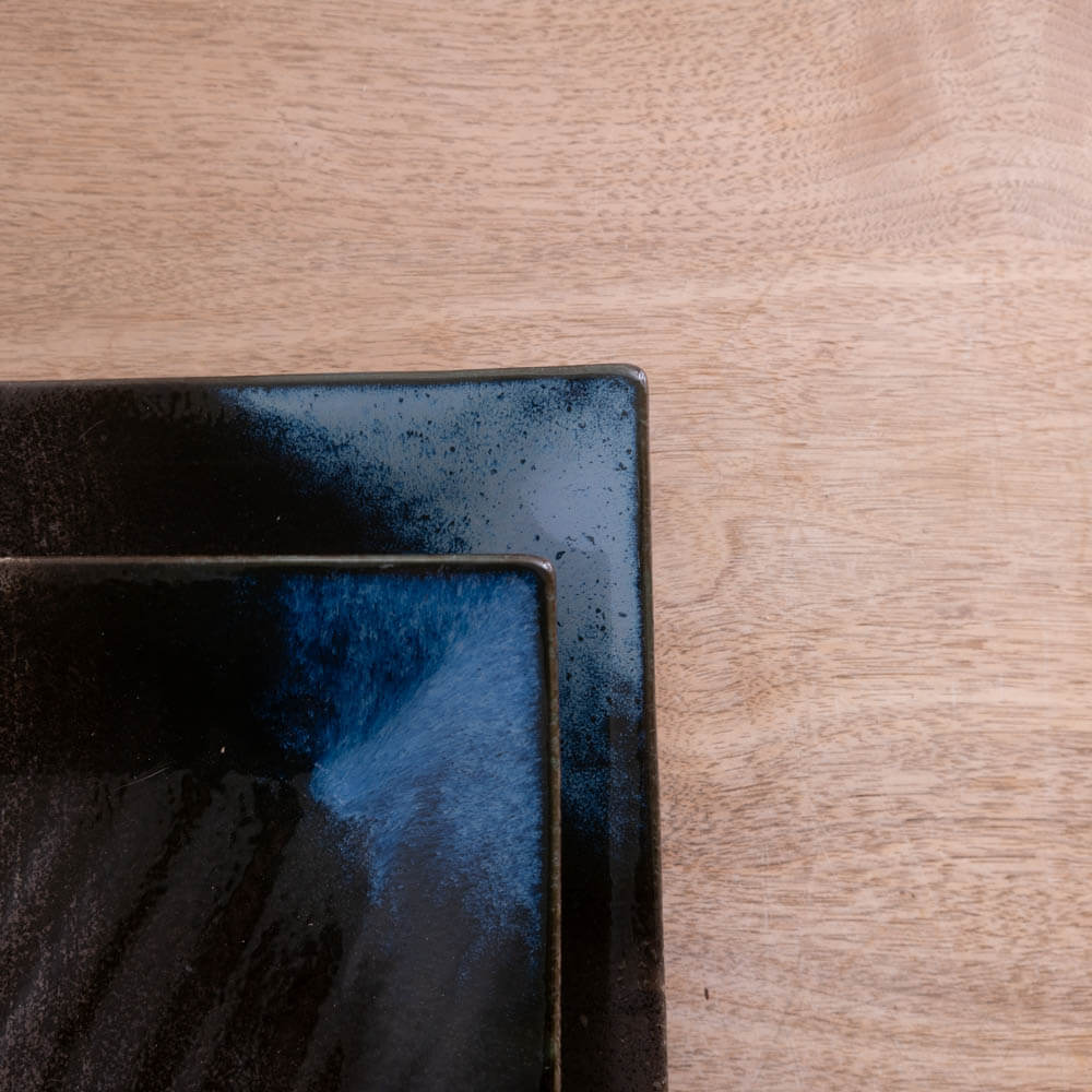 釉薬の濃淡が生み出す、静かな揺らぎ。光の当たり方によって、黒は深く、青はやわらかく表情を変えていきます。主張しすぎず、それでいて印象に残る。料理の色や質感を引き立てながら、器そのものも美しく在る——そんな絶妙なバランスが、この器の魅力です。