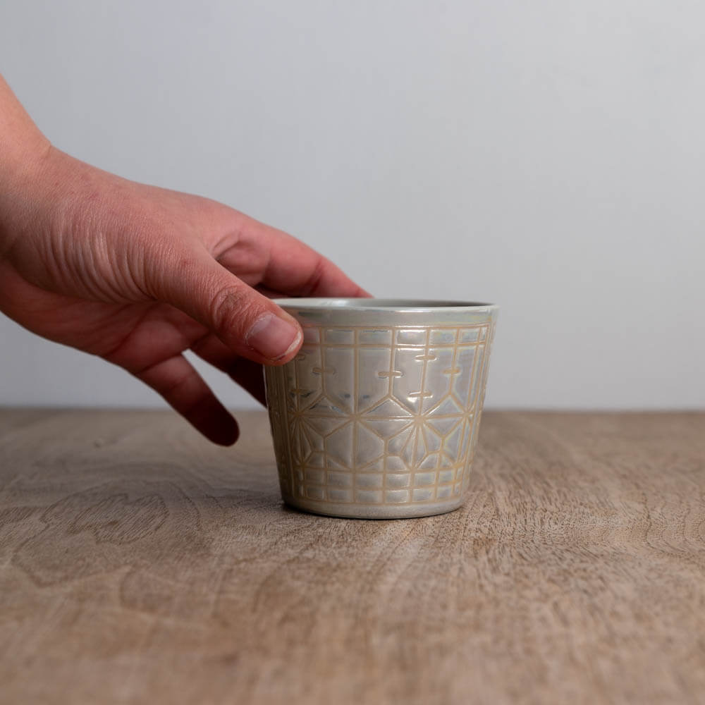 白い器なのに、真っ白ではない。やわらかな白磁の中に、光を受けてふわりと浮かぶメタリックの揺らぎ。障子や組子細工の構造美を思わせる文様が、器の表面に静かな陰影を生み出します。手に取る角度、置く場所、照明によって、表情が少しずつ変わるそば猪口です。