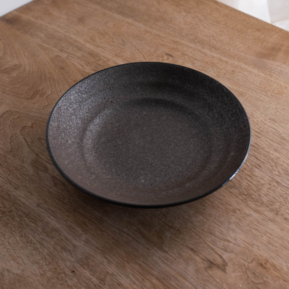 表面には、細かな鉄点や濃淡がやわらかく現れています。均一ではない表情が、手仕事ならではの奥行きを生み、光の当たり方で印象がゆっくりと変化します。マットで落ち着いた質感は、料理の色を引き立てながら、食卓全体を穏やかな空気で包み込みます。主張しすぎないからこそ、毎日の器として自然に馴染みます。
