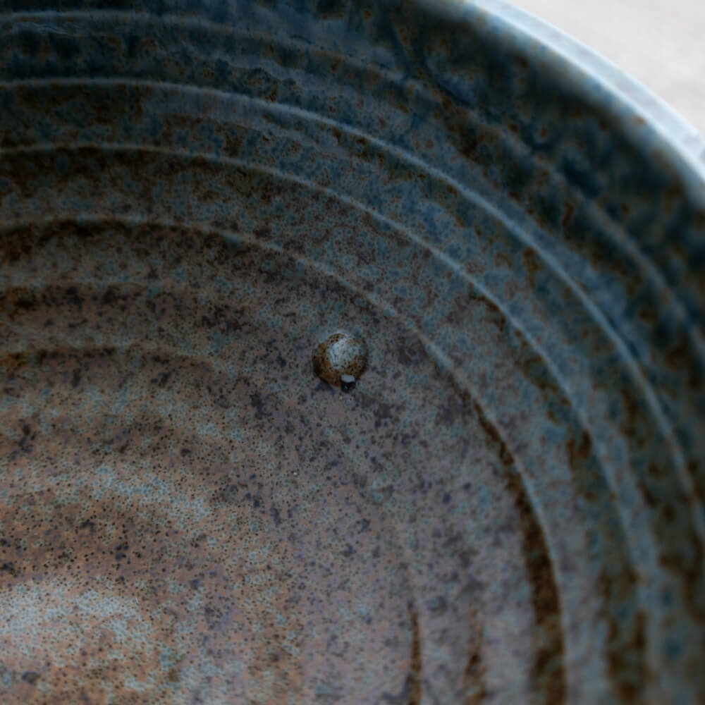 釉薬の奥にのぞく土の粒子が、静かな表情をつくり出しています。青みを帯びた色合いは、光の入り方や料理の色によって印象が変わり、使うたびに新しい表情を楽しめます。均一ではないゆらぎがあるからこそ、器そのものが景色になり、盛りつけた料理をやさしく引き立ててくれます。