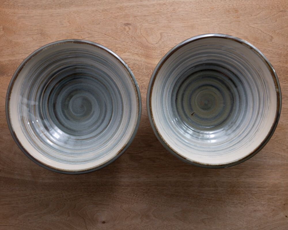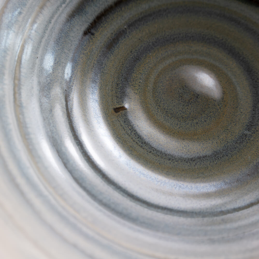 内側に広がる渦模様は、釉薬が自然に流れて生まれたもの。一つひとつ異なる表情があり、同じものはひとつとしてありません。淡いグレーからやさしい生成りへと移ろう色合いが、器の中に静かな奥行きを生み出します。