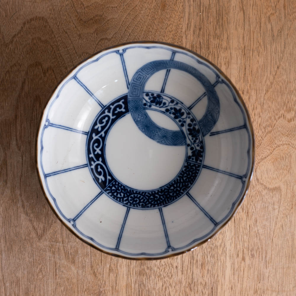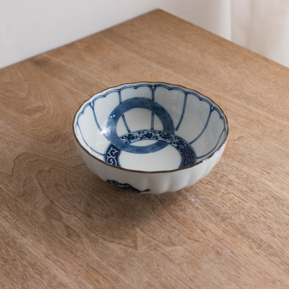 ふんわりと広がる菊割りのかたちに、静かに連なる輪つなぎ文様。やわらかな白磁の中に、藍の線がすっと溶け込み、盛りつける料理を引き立てながら、食卓全体を穏やかに整えてくれる中鉢です。日常の器でありながら、どこか凛とした佇まい。使うたびに、心がすっと落ち着くような一枚です。
