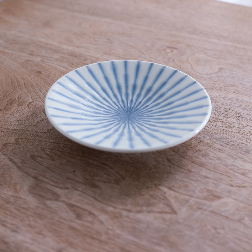 中心から放射状に広がる線模様が、料理へと視線を導きます。均一すぎない揺らぎがあり、手仕事ならではのやわらかさを感じられます。