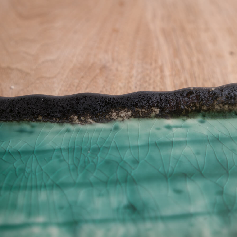 中心の青緑は、釉薬の濃淡によって“にじみ”や“揺らぎ”が生まれ、同じものがひとつとしてない景色に。光の当たり方で印象が変わり、静かな存在感を放ちます。