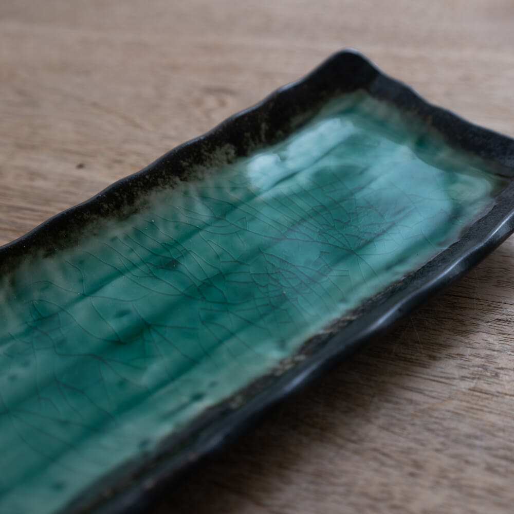 黒の縁取りと、奥行きのある青緑の釉景が印象的な「深海アナゴ皿」。細長いフォルムが盛り付けをきりっと整え、いつものおかずも一段と映えます。