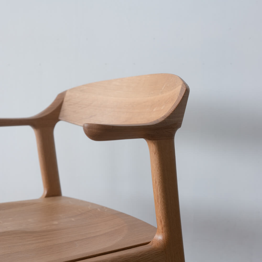 日本の家具づくりの美意識と、日常を支える実用性。その両立を、無理なく・誠実に形にした一脚です。クラフト感のあるやわらかな曲線、ホワイトオーク無垢材の確かな質感、そしてテーブルに掛けられるハンギング機能。毎日の食卓で「使いやすい」と「美しい」を同時に感じられるアームチェアです。