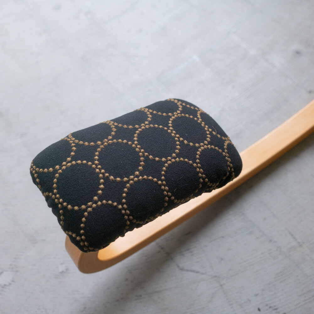 張地には、ミナ ペルホネンを象徴する“tambourine”を使用。手描きの円が連なった図案は、穏やかなリズムを生み出します。刺繍糸は使い込むほどに表情が変化し、少しずつ下地の色がのぞくことで、持ち主だけの風合いへ。深みのあるインディゴカラーに、リズムを刻むような刺繍が施されています。