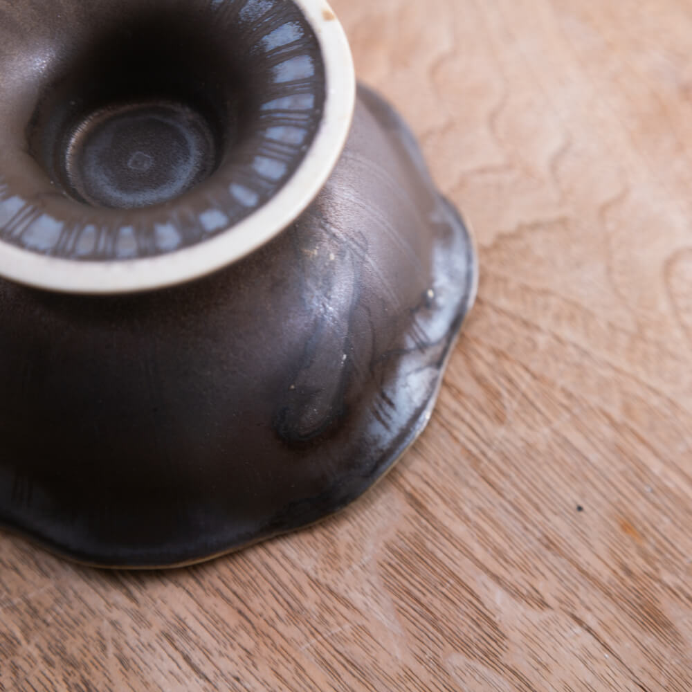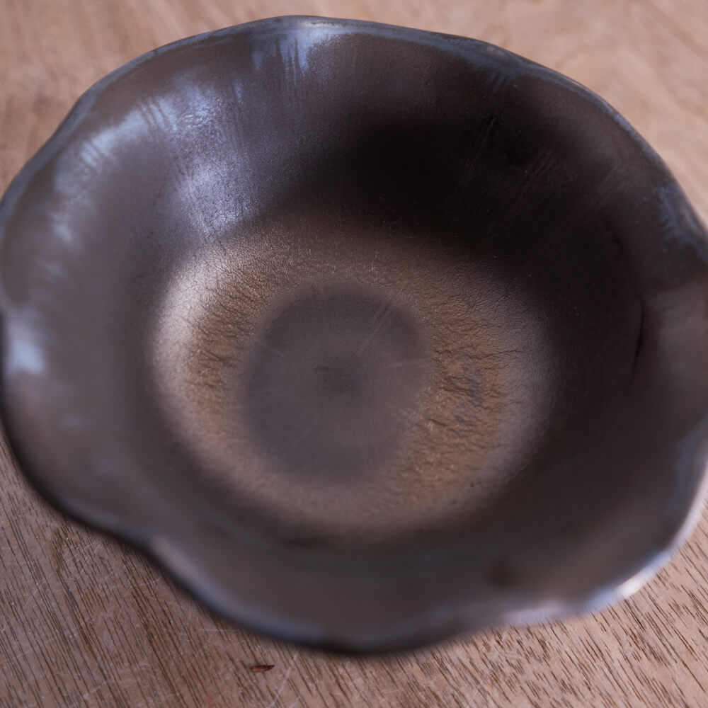 表面にあらわれる濃淡やにじみは、釉薬が流れ、焼き上がる過程で生まれた自然な表情。光の当たり方によって、黒にも茶にも、やわらかな灰色にも見え、表情を変えていきます。同じものはふたつとない、静かな個性が魅力です。