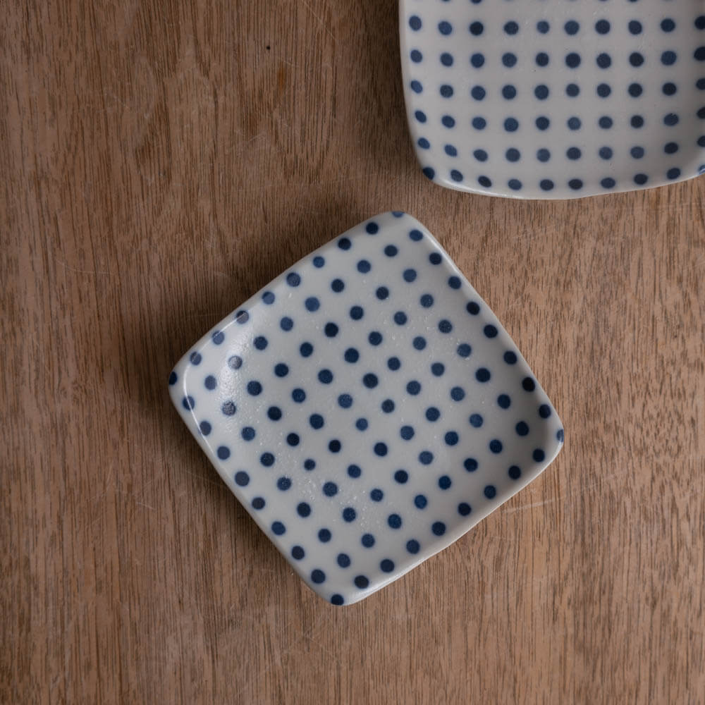 なめらかで明るい白磁に、藍のドットがやさしく映えます。汚れが付きにくく、扱いやすいのも嬉しいポイント。毎日気兼ねなく使える器です。