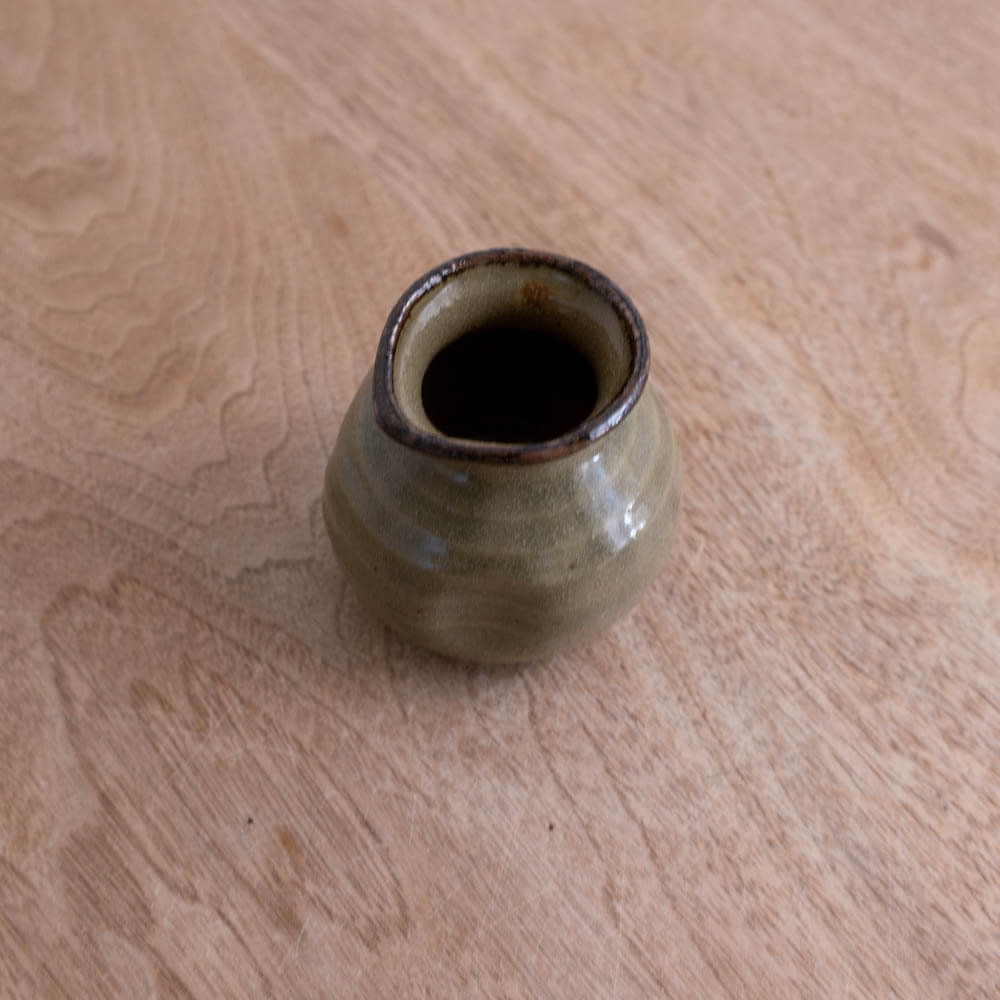 やや緑を帯びた黄瀬戸釉に、縁へとにじむ褐色。焼成の中で生まれた釉の揺らぎが、この小さな徳利に豊かな表情を与えています。手のひらに収まるほどのサイズ感で、そば徳利としてはもちろん、使わない時間も食卓や棚にそっと置いておきたくなる佇まいです。