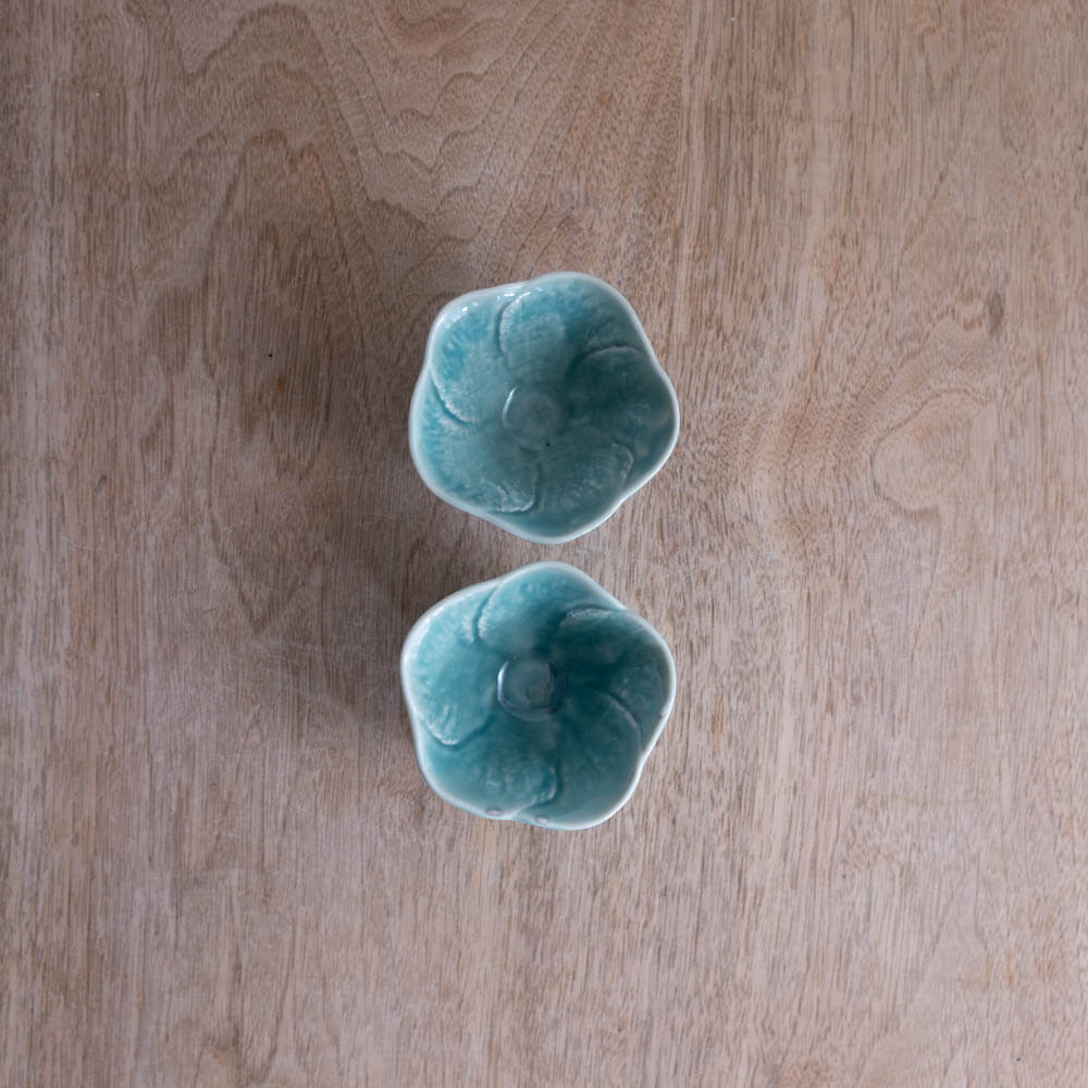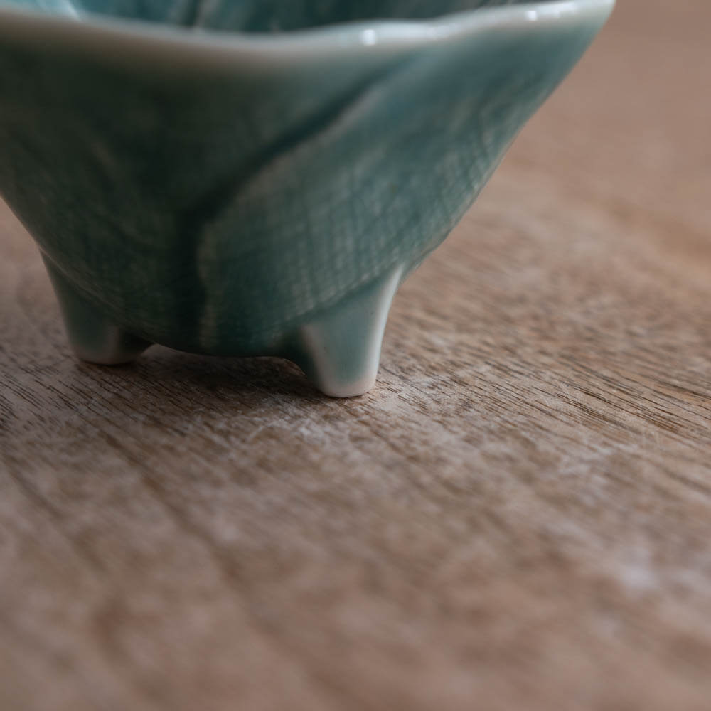 やわらかな青緑が、静かに広がる花のかたち。光を受けてほのかに揺らぐヒワ色は、澄んだ空気や水面を思わせるやさしい表情です。小さな器でありながら、食卓にそっと余白を生み出してくれます。