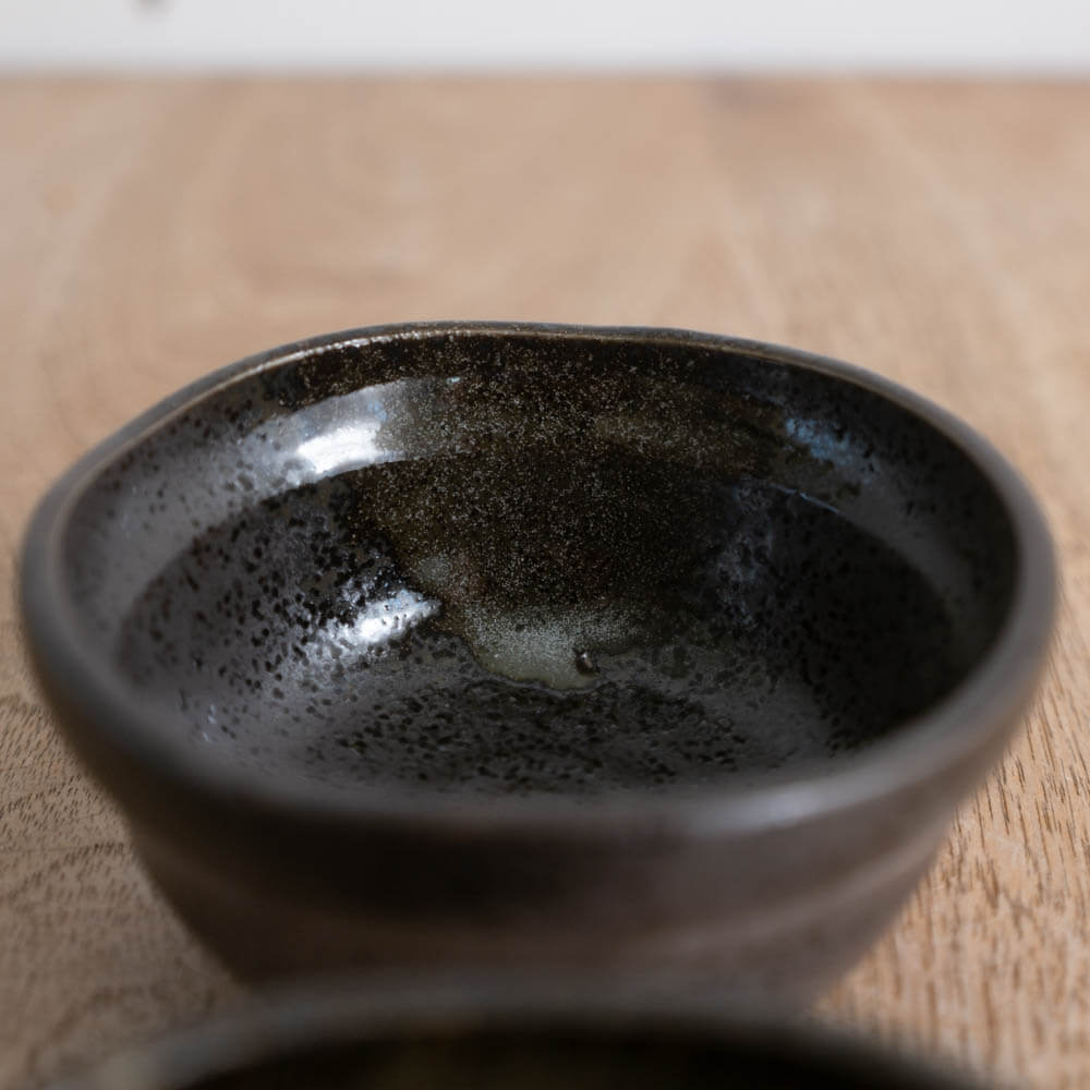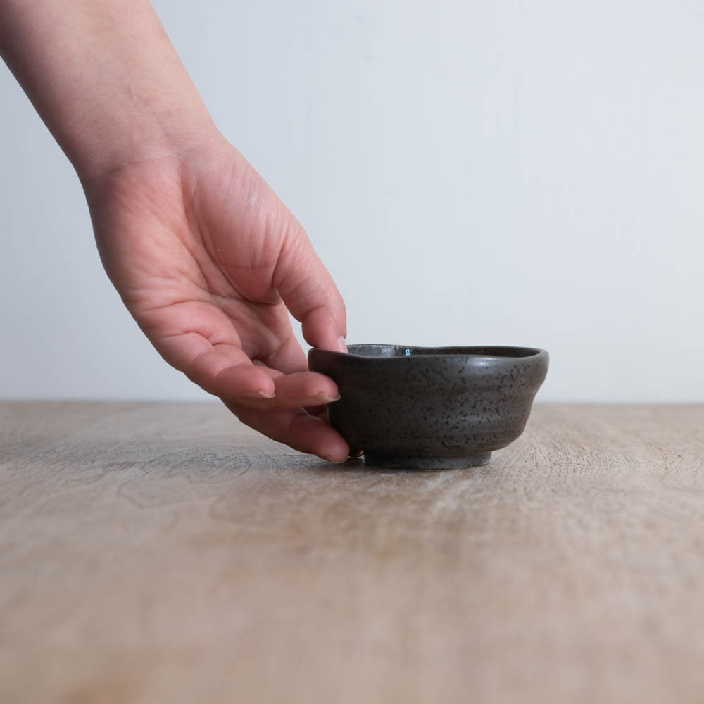 静かな黒の中に、細やかな鉄粉がきらりと浮かぶ。主張しすぎないのに、確かな存在感を放つ小鉢です。装飾をそぎ落とした無地の表情だからこそ、素材そのものの風合いや、料理の色合いが美しく引き立ちます。
