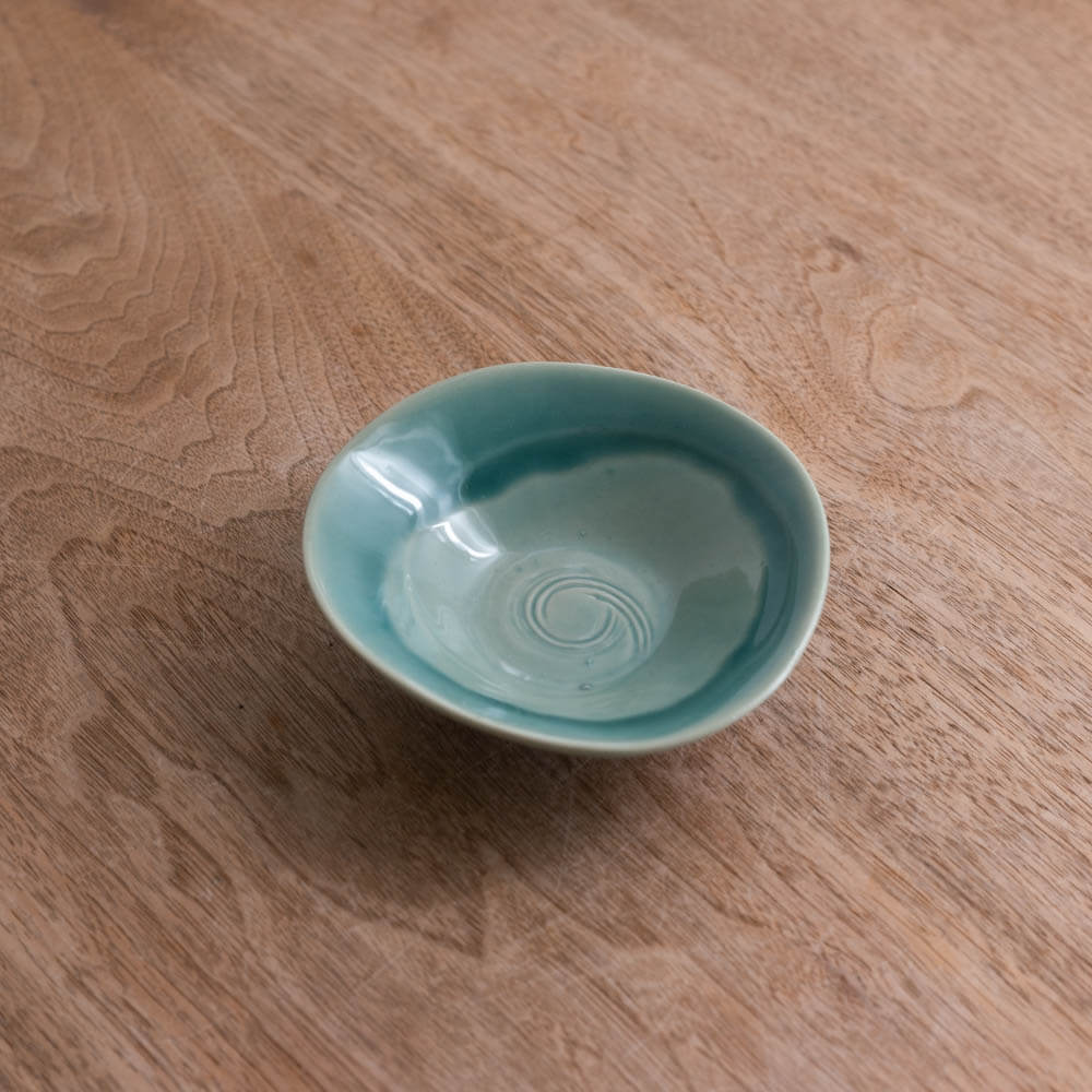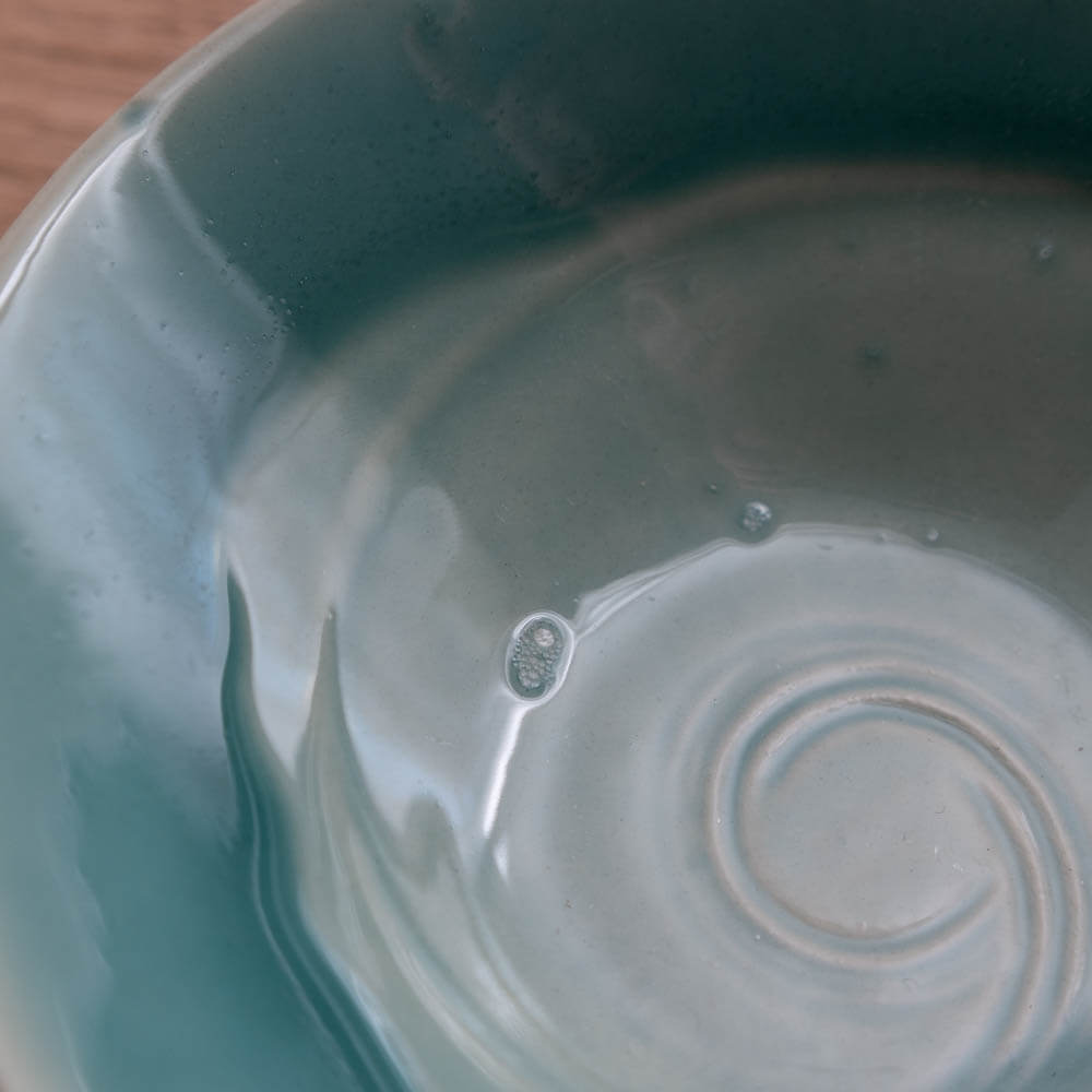 やわらかな緑をたたえた、静かな佇まい。水面のように揺らぐ釉の表情が、料理の色をやさしく受けとめます。中心に向かって生まれる淡い濃淡と、縁にかけてのゆるやかな揺らぎ。まるで水が静かにたゆたうような、落ち着きのある景色が広がります。