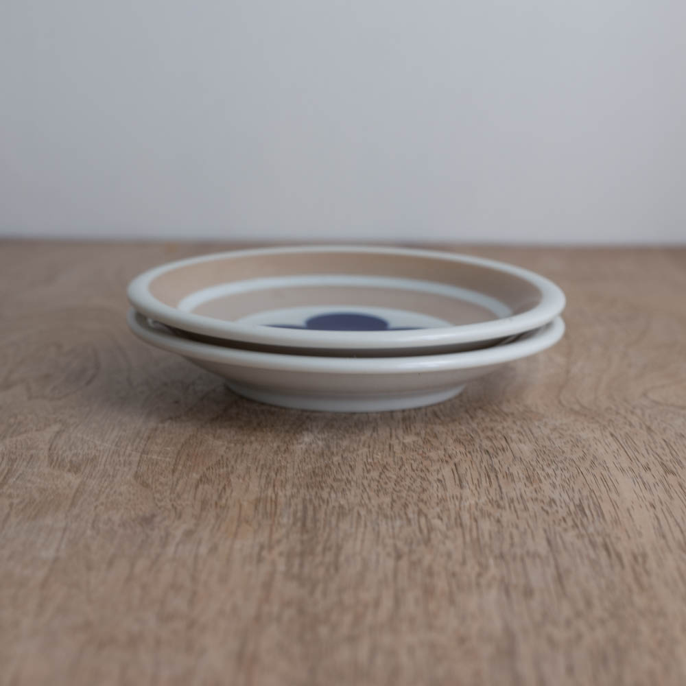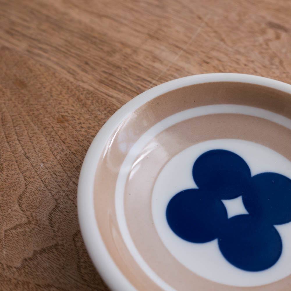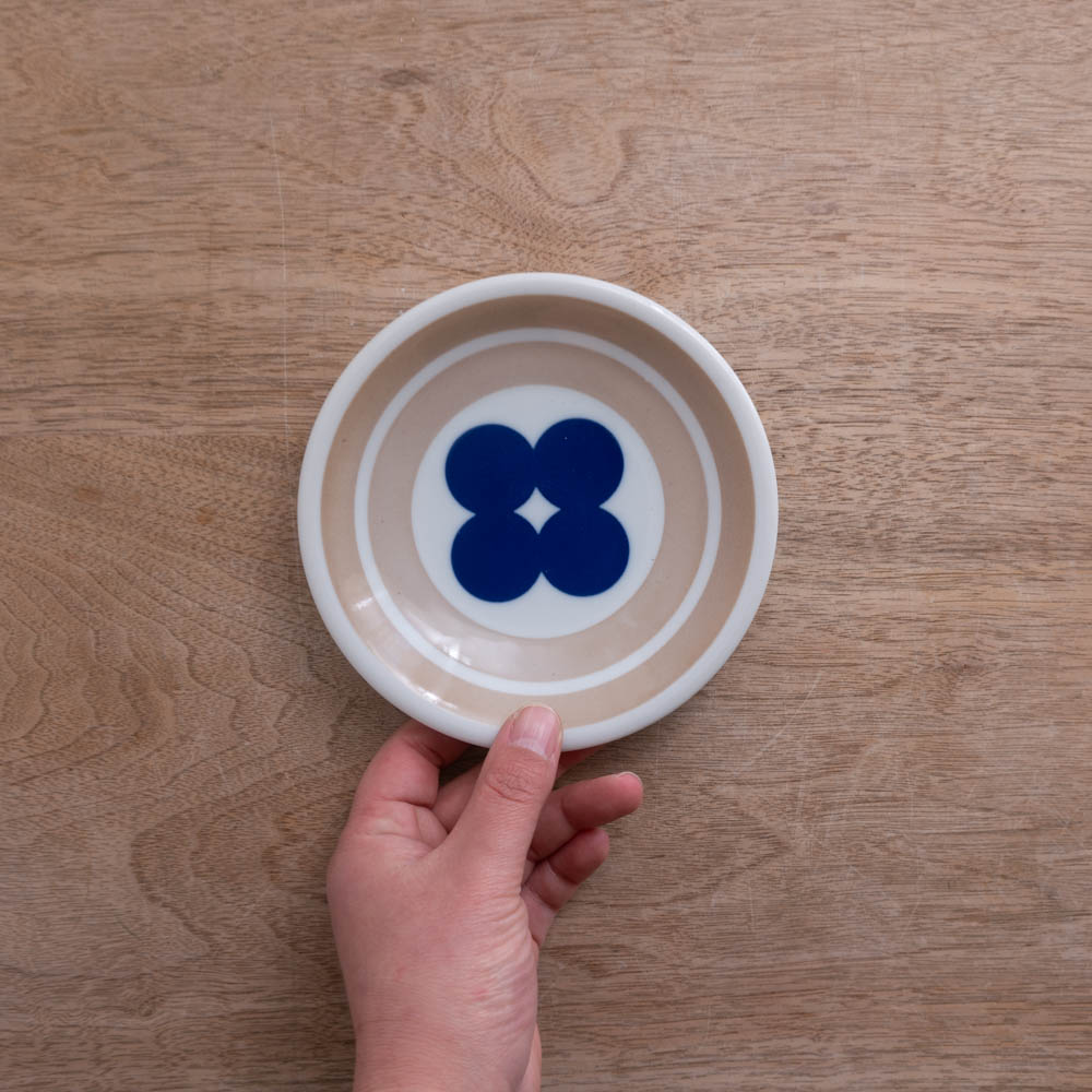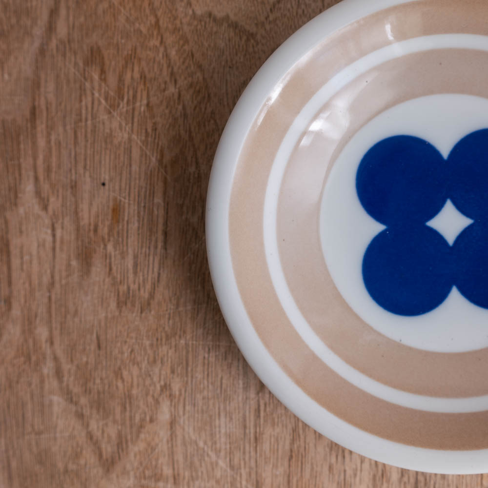 やわらかなベージュの地色に、深いブルーの図案。どこか懐かしさを感じさせる配色と、気取らない佇まいの小さな丸皿です。この器は、おそらくノベルティとして企画・製造されたシリーズの一部。日常の中で気軽に使ってもらうことを想定してつくられたため、使いやすさと親しみやすさが、自然と形に表れています。製造工程の中で生まれた表情の違いにより、一般流通には乗らなかったものが、アウトレット品として届きました。