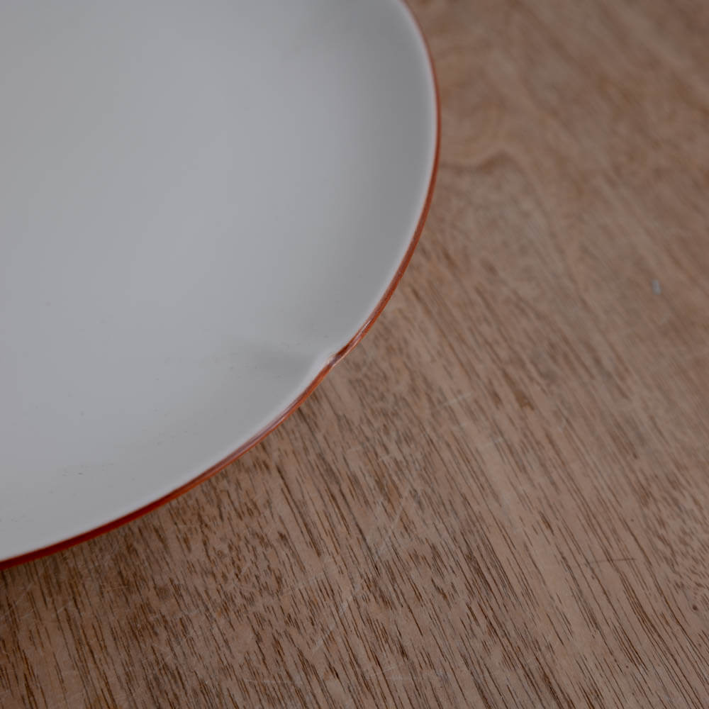 縁に施されたさび色が、白磁の明るさを引き締め、全体を上品な印象に。やわらかさの中に、凛とした表情を添えています。料理の色味を引き立てながら、和食にも洋食にも合わせやすい仕上がりです。