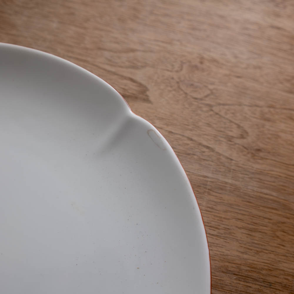 花型のやわらかな輪郭に、きりっと効かせたさび色の縁。白磁の静けさと、凛とした表情が共存する、大きめサイズのプレートです。装飾的になりすぎず、料理を受け止める余白が美しい一枚。日常の食卓にも、少し整えたい日の食事にも、自然と馴染みます。