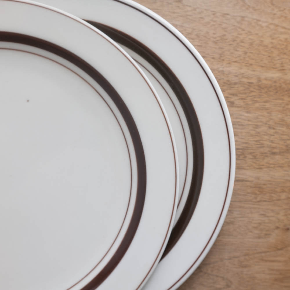 縁に入ったブラウンラインが、料理の輪郭をやさしく引き締めてくれます。中央に自然と視線が集まり、盛りつけに迷わず、すっきりとした印象に。