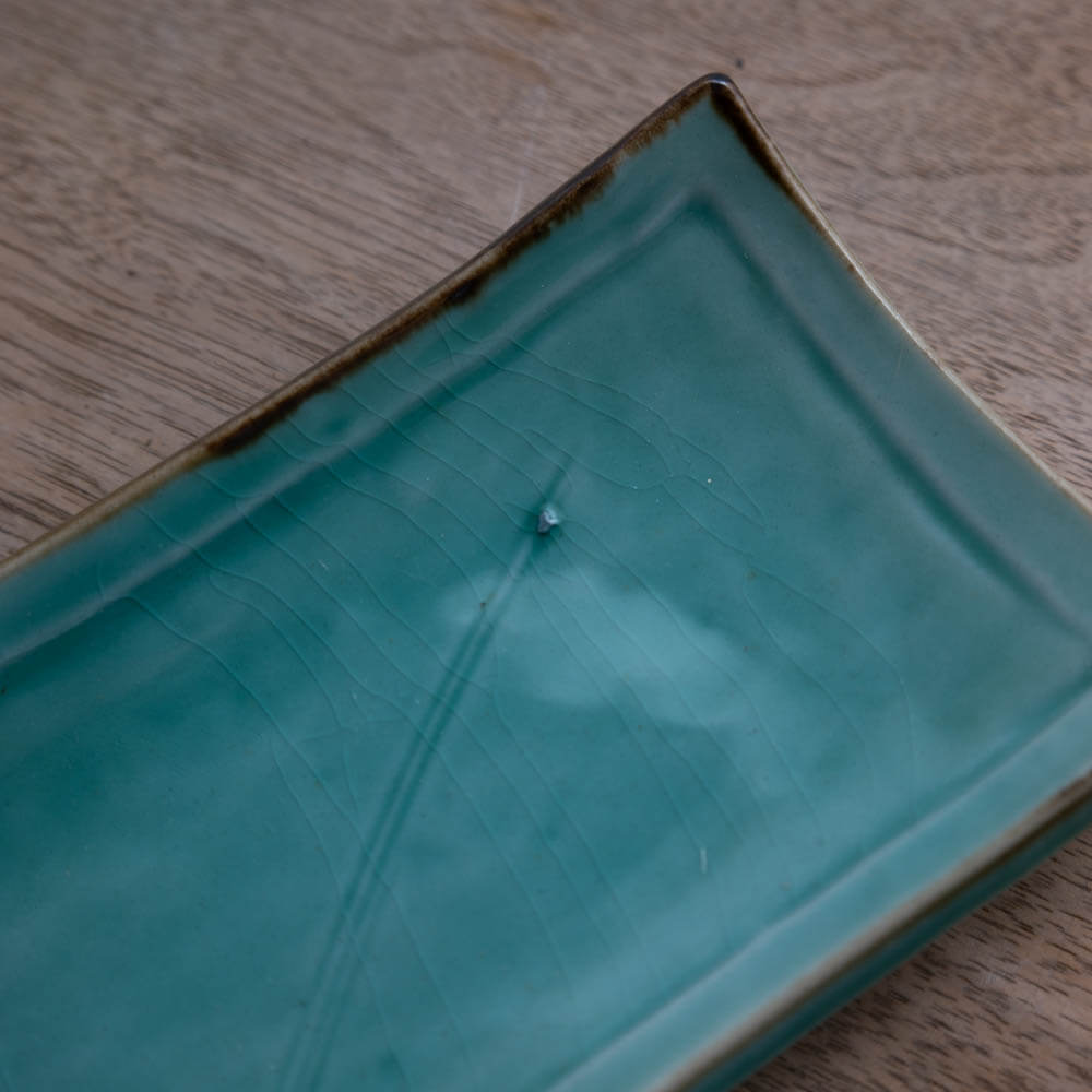 淡い青緑のヒワ色が、料理の色をやさしく受け止める角長皿。光を含んだような釉調と、すっと伸びる細長いかたちが、盛り付けに静かなリズムと余白を生み出します。主張しすぎず、それでいて印象に残る一枚。日常の一皿も、少し特別な景色に整えてくれます。