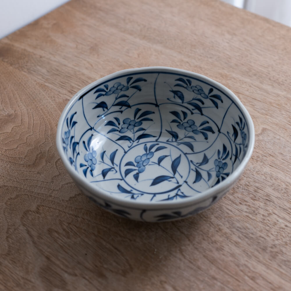 器の内外に描かれた藍の草花文様は、見る角度によって表情を変え、食卓に奥行きを添えます。料理を盛ることで模様が引き立ち、器そのものが“景色”になるような一枚。伝統的な染付の美しさを、日常の中で楽しめます。