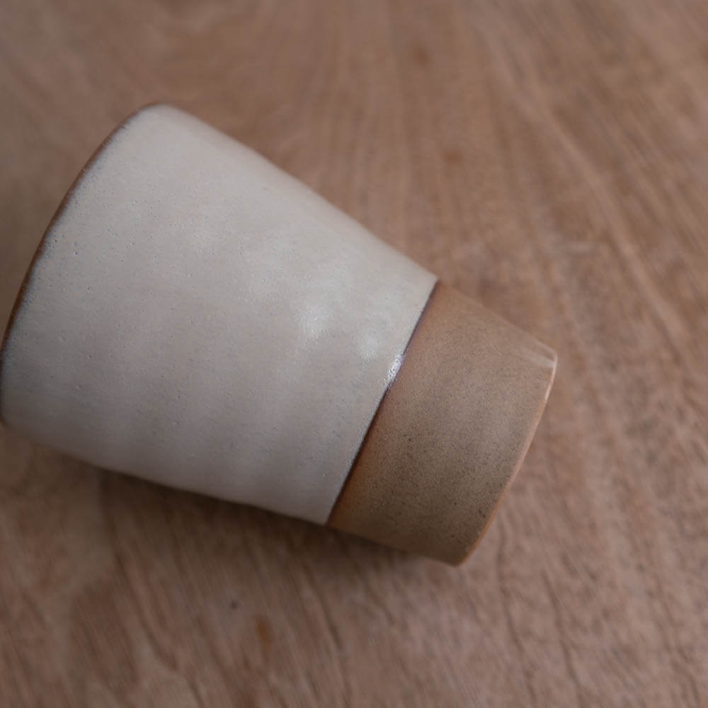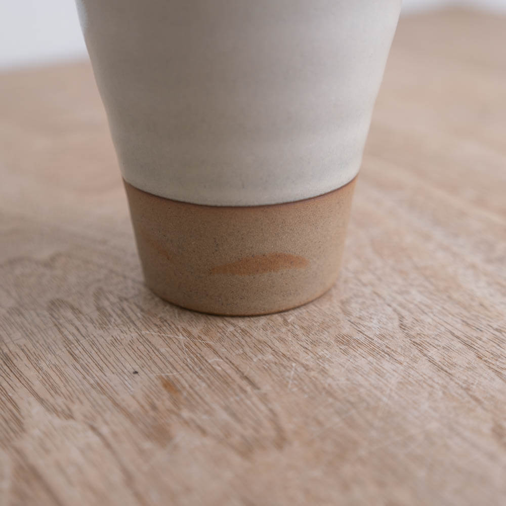 釉薬に覆われすぎず、土の気配をほんのりと残したフリーカップ。クリーム色から淡い茶へと移ろうグラデーションは、焼成によって自然に生まれたものです。白でもなく、茶でもない、その中間のやさしい表情が、日々の飲みものの時間を静かに整えてくれます。毎日使うからこそ、目立ちすぎず、けれど確かに心に残る。そんなバランスを大切にした一杯です。