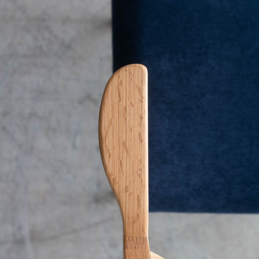 座面は取り外し可能なカバーリング仕様。カバーの下はブラックの合成皮革張りになっており、万が一外した状態でも見た目が崩れにくい設計です。クッションは沈み込みすぎず、長時間座っても疲れにくいバランス。ネイビーのファブリックが、ナチュラルな木部をほどよく引き締めます。