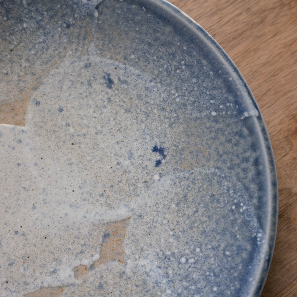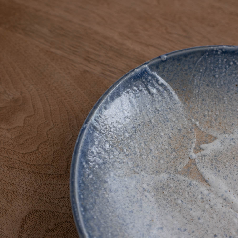 この皿の最大の魅力は、青釉と白釉の重なりに、サビ色がにじむように現れる景色。色が均一に整えられていないことで、流れ・溜まり・境界が生まれ、一枚の中に静かな動きと深みが宿ります。焼き色のある料理や、素材感の強い食材とも自然につながり、料理の色を引き立てる背景として機能します。