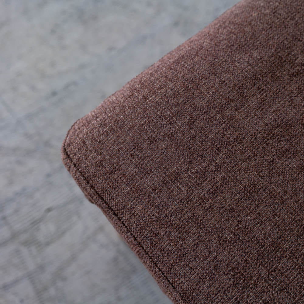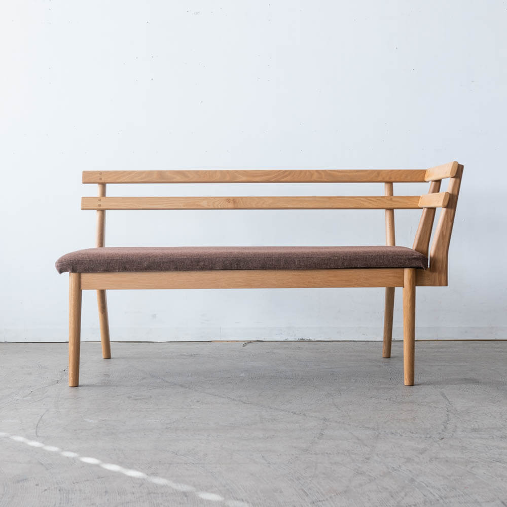 座面にはウレタンフォームを使用し、しっかりとした安定感のある座り心地。ベンチ特有の硬さを感じにくく、長時間座っても疲れにくい設計です。張地はダークブラウンのファブリック。明るいオーク材を引き締め、ダイニングにもリビングにも合わせやすい落ち着いた印象に仕上げています。