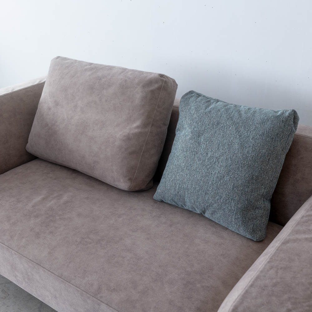 付属クッションは2サイズ構成。背中をしっかり支える730サイズは本体と同色のグレーで統一感を。490角クッションはブルーグレーを合わせ、空間にやさしいアクセントを加えています。姿勢や気分に合わせて配置を変えることで、座り心地の印象も変化します。