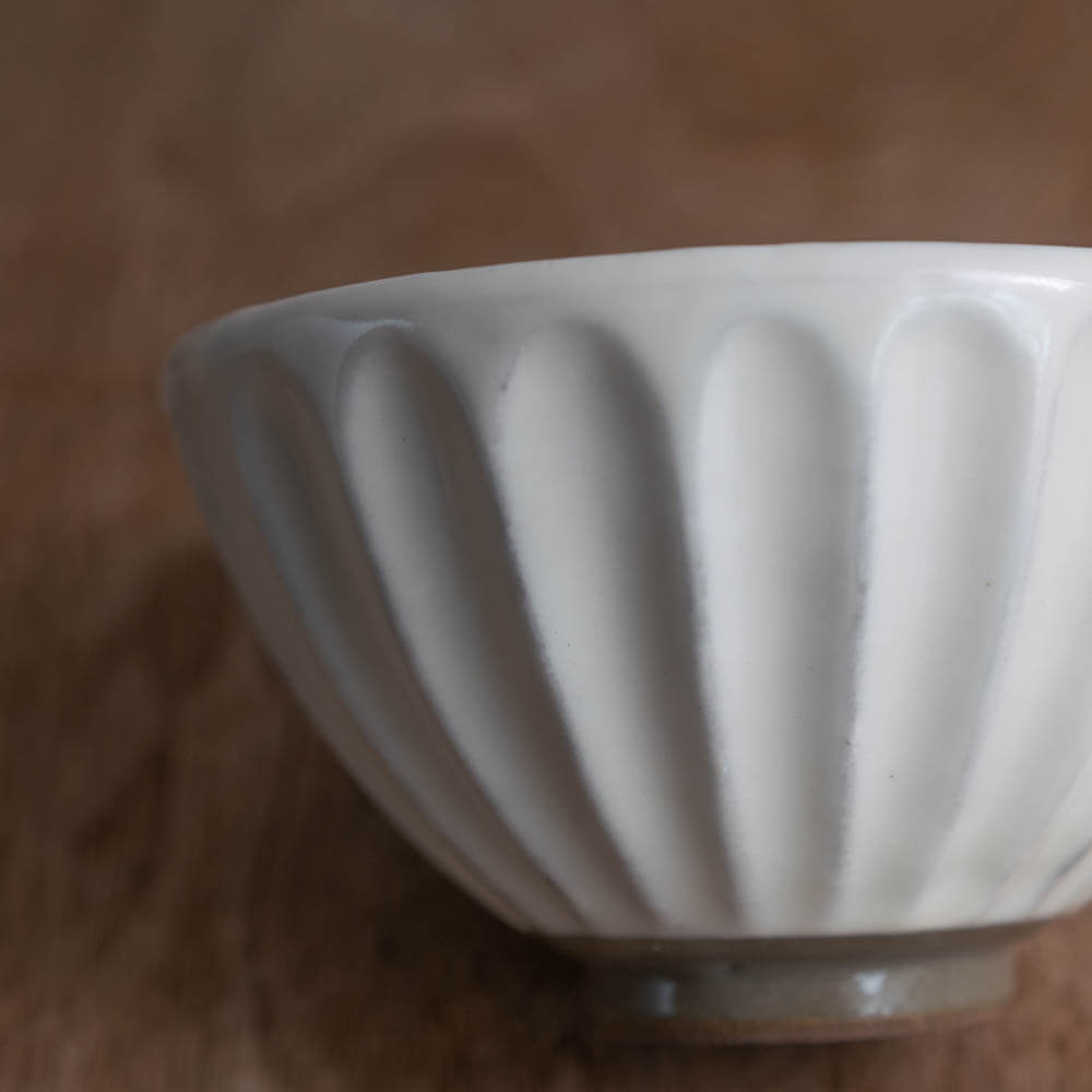 側面に入ったしのぎ模様が、光を受けてやわらかな陰影をつくります。白一色でも単調にならず、毎日の食卓に静かな表情を添えてくれます。料理を邪魔せず、それでいて無地とは違う存在感があります。