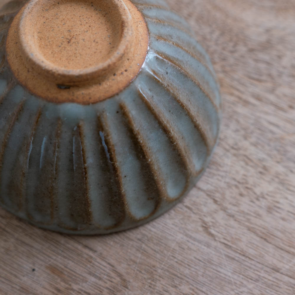 釉薬が均一に覆い尽くされていないため、ところどころに素地の色や質感がうっすらと現れています。そのわずかなムラが、器全体に奥行きを与え、しのぎの陰影をより豊かに見せてくれます。整いすぎない表情が、ご飯の白を自然に引き立てる理由のひとつです。