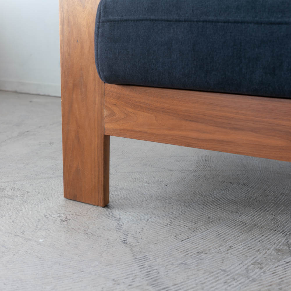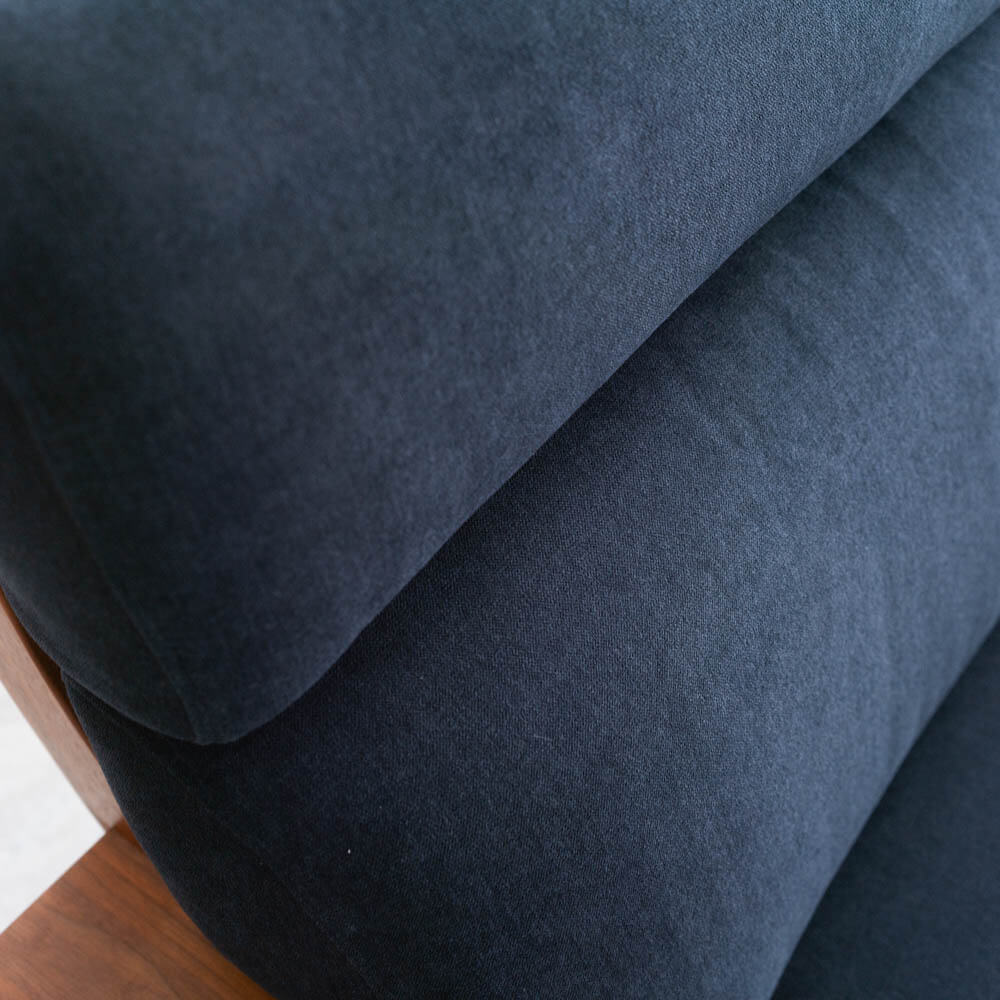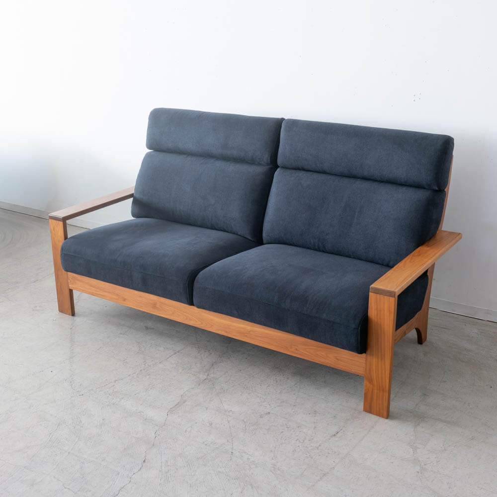 深く腰を下ろした瞬間に、背中から首までをやさしく受け止めてくれるハイバック。ウォールナットの落ち着いた表情と、ネイビー張地の静かな存在感が、リビングに自然な品格を添えます。「長く座ること」「毎日使うこと」を前提に設計された、日本製ソファです。