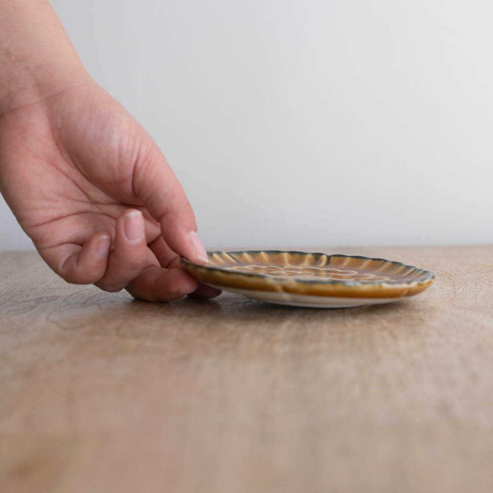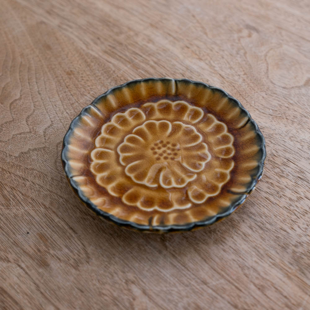 あたたかみのある琥珀色の釉が、幾重にも重なり合い、花が開くような文様を描いた銘々皿。中心から広がるぼたん文様は、料理やお菓子をやさしく受け止め、盛る量が少なくても、自然と一皿として整えてくれます。日常の取り皿としても、特別なひとときの菓子皿としても、静かに活躍してくれる一枚です。